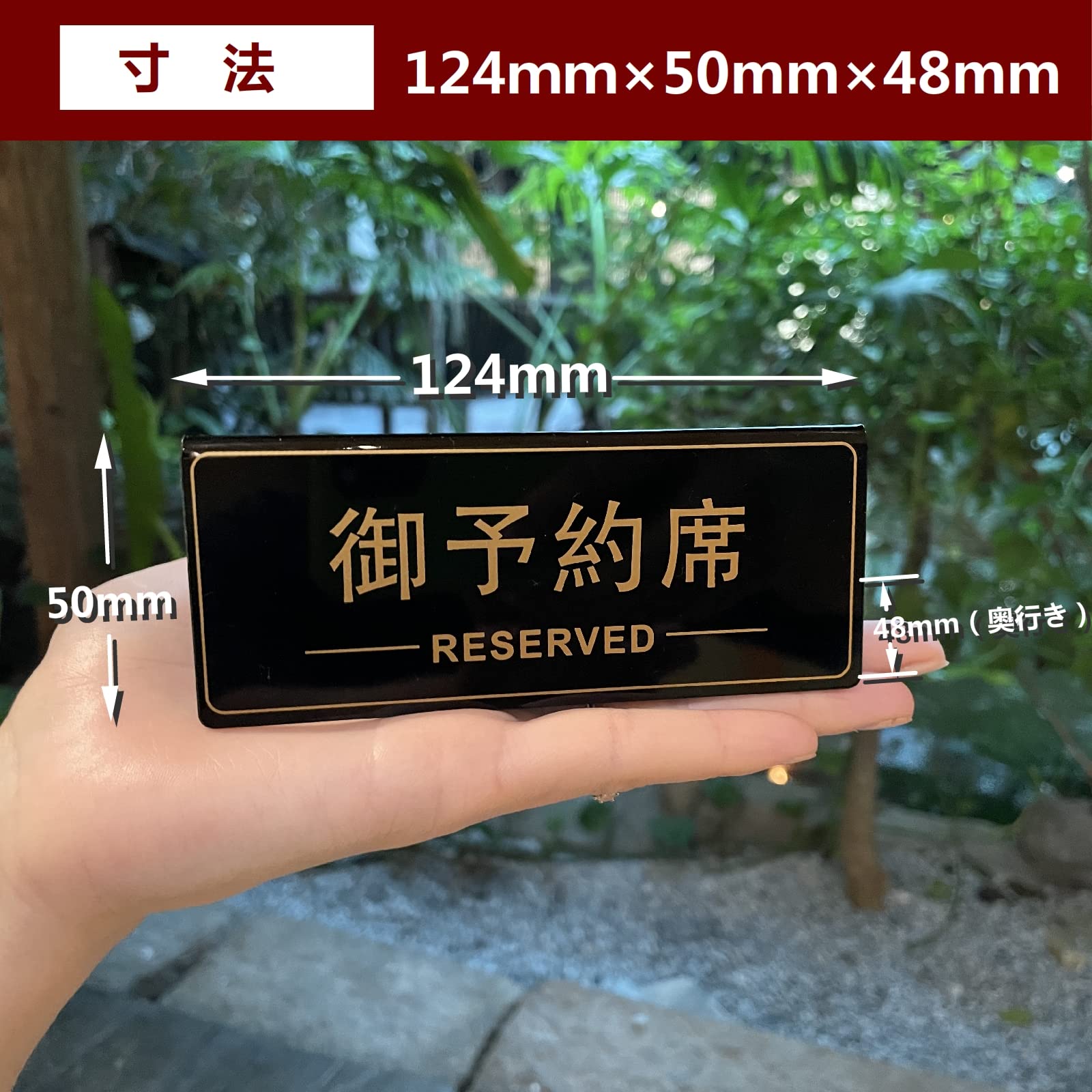 【視認性が良い】日本語「御予約席」と英語「RESERVED]で両面に同時に印刷され、ちょうど良いぐらいの大きさが、遠くからもわかる存在感の高いプレートです。