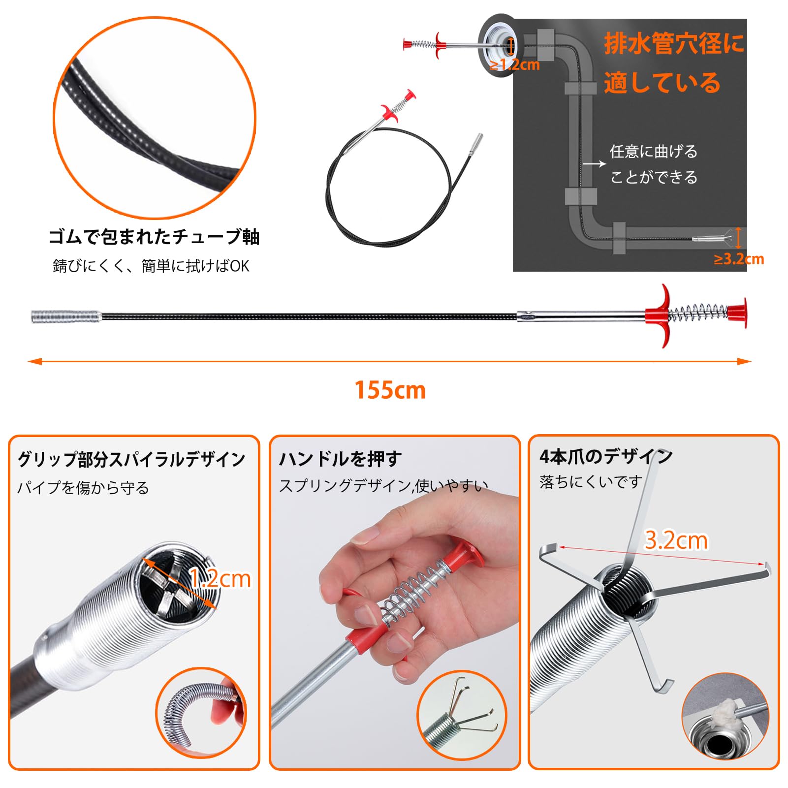 【柔軟で細長い4爪 パイプクリーナー】① 柔軟性。パイプクリーナーは、耐久性に優れたステンレスとPP製で、軸は自由に曲げて使用できるフレキシブル構造なので、排水管に簡単に差し込み、髪の毛やゴミを取り除き、排水管の詰まりを解消します。② 長さ160 cm。パイプクリーナーは長くて細い構造で、狭い所でも心配なく掃除できます。③ 4本爪のデザイン。4本爪のデザインで排水管の詰まりを掴みやすく、落ちにくいです。④ 操作簡単。a、爪フックをパイプ内に伸ばします。b、これ以上伸ばせない場合は、3?4cm後退し、スペースを空けてください。c、赤いハンドルを押し下げて取り出し、この操作を数回繰り返します。d、詰まりを簡単に取り除く。