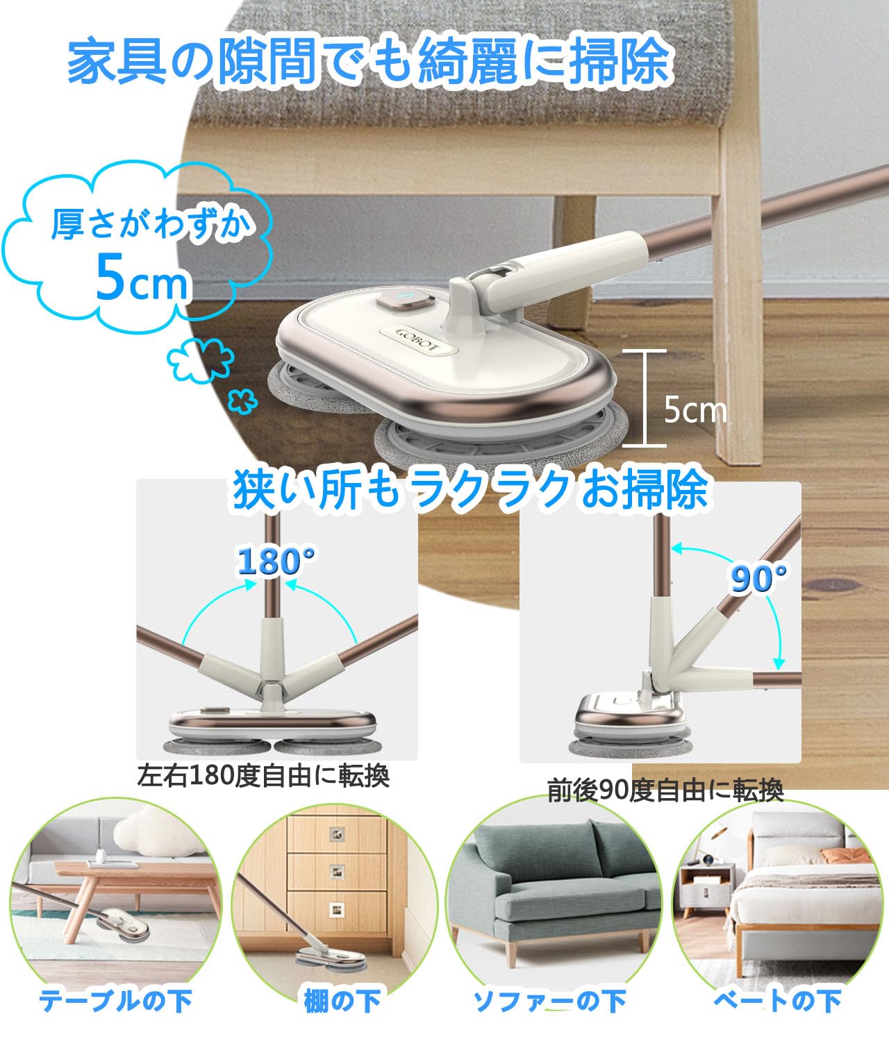 【GOBOTコードレス回転モップクリーナー】回転モップは回転速度が重要!GOBOT回転モップはより速く、より強力な洗浄能力を備えており、回転速度は最大200回転に達することができて、力を入れず、汚れやほこりをしっかりと拭き取ります。掃除効率を向上して、楽々になれますので、 家事に苦労した人を解放できて、この電動モップをお勧めております。