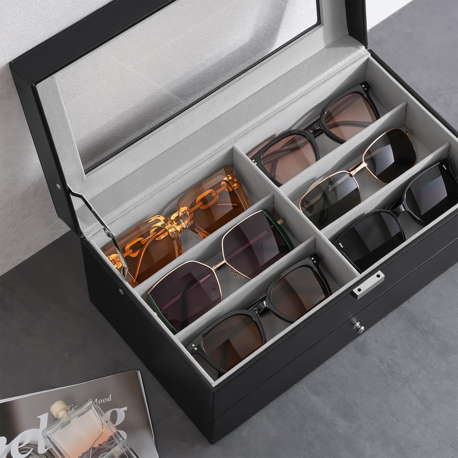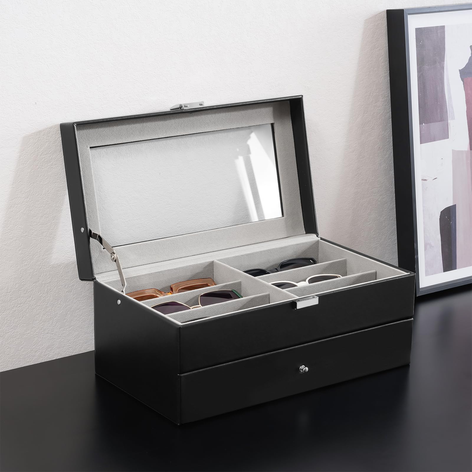 ?【実用性抜群】普段使いのメガネや腕時計、アクセサリーと一緒に収納できる2段ボックスは、ホコリを防ぐ同時に、仕切りも設けられているので、メガネを個別に収納することで、サングラスが多くてもどこにあるのか分かりやすく、取り出しやすくなります。