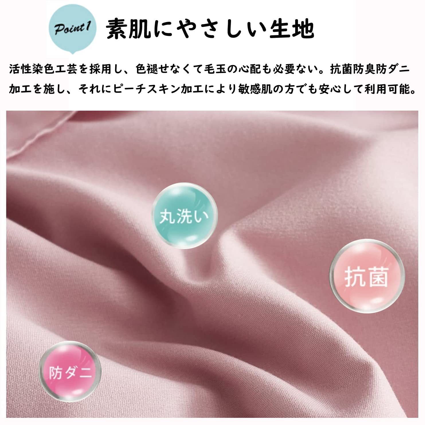 【素肌にやさしい生地】:活性染色工芸を採用し、色褪せなくて毛玉の心配も必要ない。毎日、素肌に触れるものだからこそ、抗菌、防臭、防ダニ加工を施しています。ピーチスキン加工により敏感肌の方でも安心して利用できます。