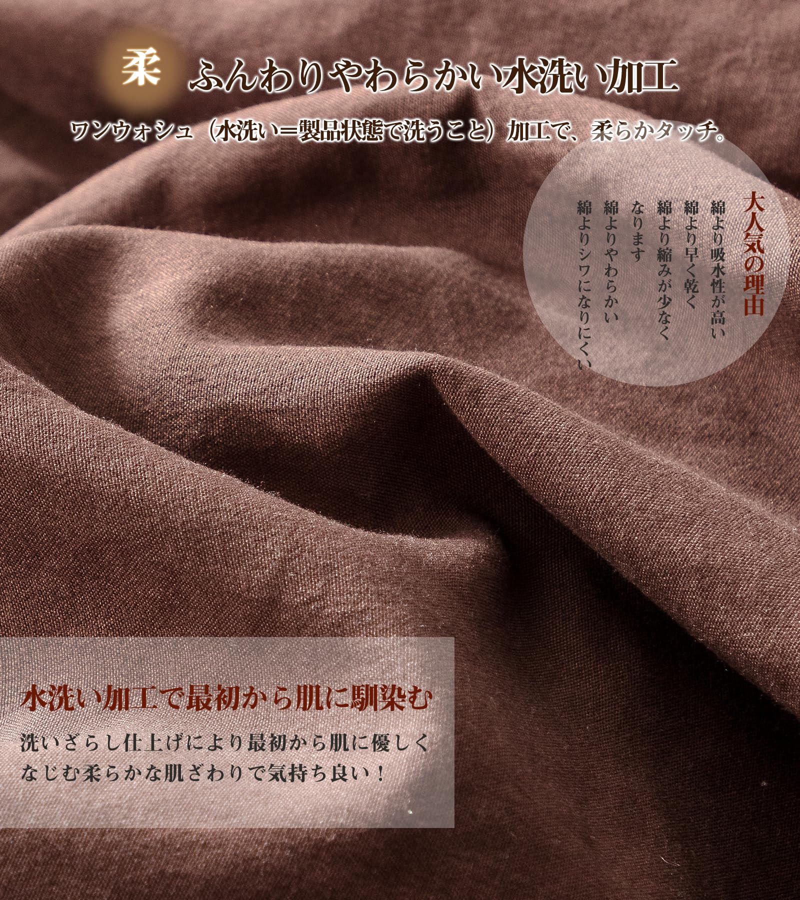 【水洗い加工まくらカバーの特徴】こだわり①「超吸水速乾 & 0秒吸水」まくらカバーは吸水速乾機能で汗をかいてもすぐに吸い取って乾きます。サラッとした肌触りでベタつきません。快適に眠ることができます。 こだわり②「優れた速乾性」水洗い加工のまくらカバーは速乾性に優れているので、湿気による細菌の増殖を抑えられます。夏は涼しく冬は暖か寝具で、オールシーズンに快眠環境を整えます。 こだわり③「通気性抜群&オールシーズン使える」水洗い加工で普通のピーチスキンピローケースと比べ、優れた吸湿性と通気性で、汗でもベタつかないサラサラ感を保ちます。ムレにくく、春夏秋はサラサラ、冬は暖かくて一年中快適にお休みいただけます。 丁寧に織り上げることにより、耐久性にも優れたしっかりとした生地に仕上がったピローケースです。 こだわり④「抗菌防臭」汗の量が多い方にもオススメな枕カバーです。良い抗菌防臭効果で細菌の増殖を抑制し、防臭効果を発揮します。毎日、素肌に触れるものだからこそ、抗菌防臭加工を施しています。お肌の敏感な方やお子様にもご安心に使用できます。