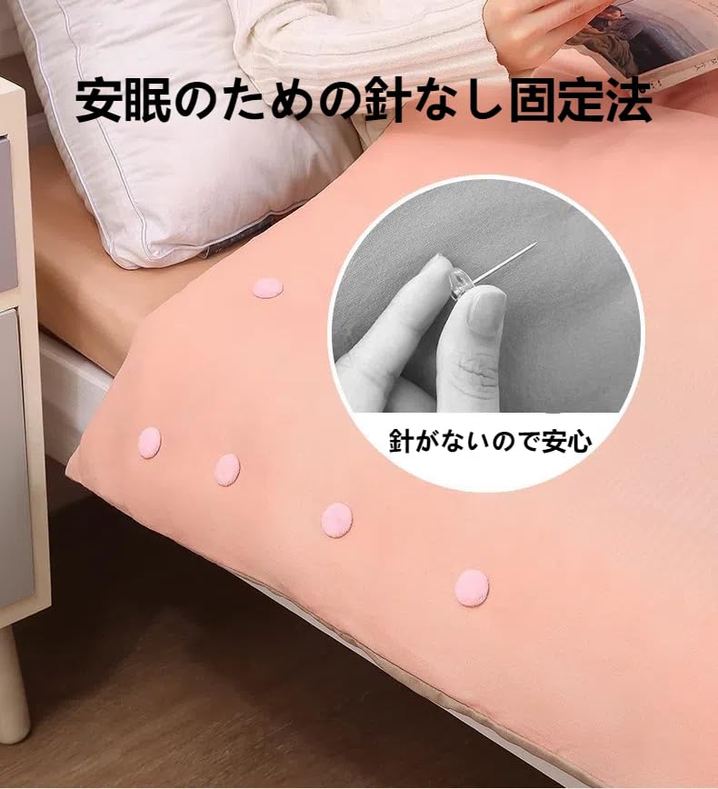 【無針設計】布団カバーホルダーは無針設計で、より良い安心感を与えることができ、お子様が使用する時、安全問題を心配する必要がなく、より安心して使用することができます。 磁石や放射線を使わず、素早く安全に布団をほぐすことができます。もう布団や毛布が床に散乱して目覚めることはありません。この固定クリップは、一晩中羽毛布団の中で羽毛布団が動き回るのを防ぎます。
