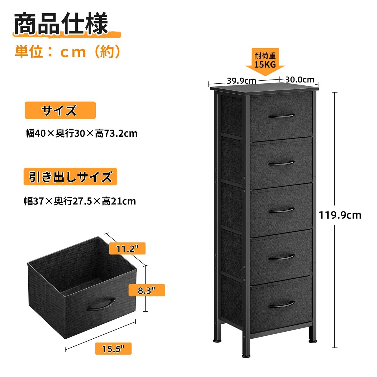 【新着】KKL チェスト タンス 収納ケース リビング収納 布製 引き出し 衣類収納 引き出し 箪笥 転倒防止 低ホルム 安定感 5段 だんす【幅40×奥行30×高さ120cm】 ブラック | GIGATERA