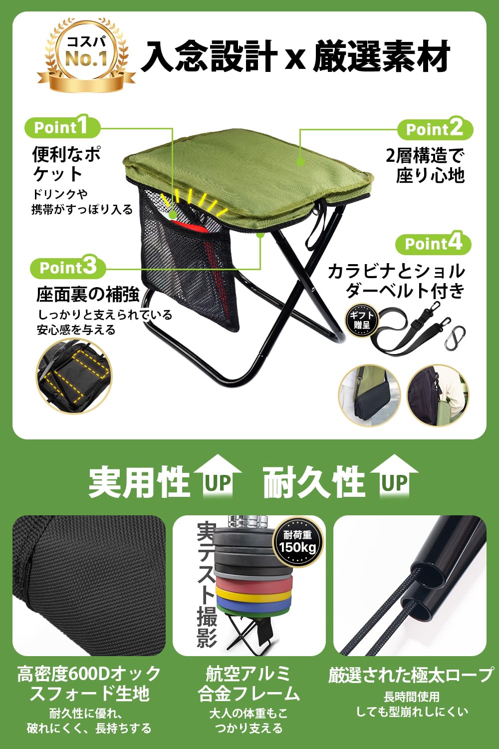 ??【コンパクトタイプ&安定性】僅か340gで水筒より軽いです。フレーム部分は6013アルミ素材でできており、軽いながら耐荷重は150kgに達しています。持ち手も付きますので、持ち運びに楽々、コンパクトで折りたたみ傘のように使えて便利です。座面は600Dの厚手で丈夫な生地を使い、張りのある安定した座り心地と耐久性を兼ね備えました。また採用のオックスフォード生地は通気性もよく、快適に過ごすことができます。