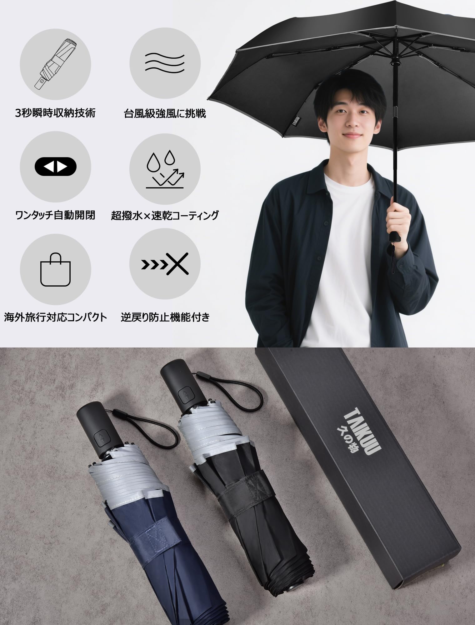 ??【形状記憶折り畳み傘】従来の折りたたみ傘の畳みにくさを克服したが新発売!独自の形状記憶加工技術を採用したTAIKUU製傘は、3秒で確実にたためる操作性を実現。収納時もコンパクトにまとまり、バッグ内でかさばらないスマートデザインが特徴です。