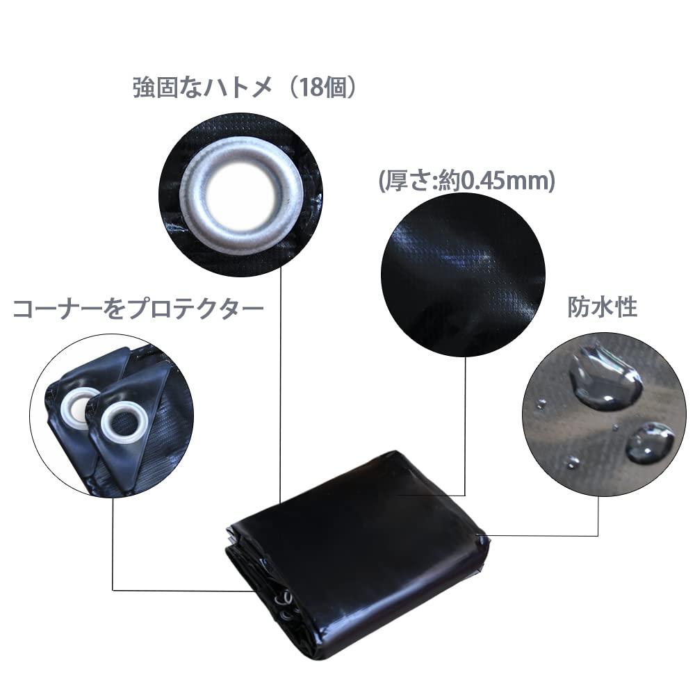 サイズ:2.1x1.9m、厚さ:0.5mm、重量:3kg。荷台シート素材:完全防水PVC帆布 、色:ブラック、ハトメ数:18個、ハトメ素材:合金材質(亜鉛めっき加工を施し防錆び・防腐食性を高めました。合金材質(亜鉛めっき加工を施し防錆び・防腐食性を高めました。