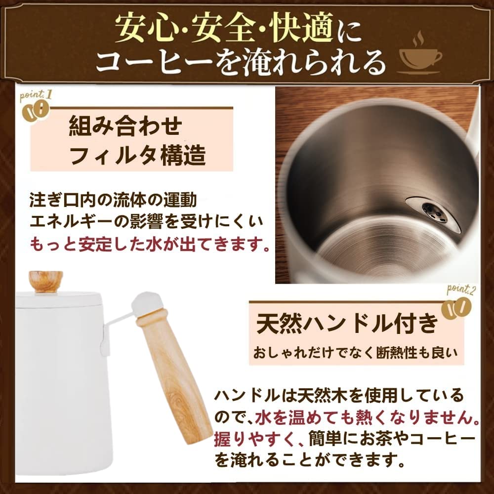 【耐熱&使いやすい取っ手】ハンドルは天然木を使用し、耐熱で、水を温めても熱くならない。 斜めのハンドルグリップの構造で、握り方に合った取っ手で楽々コントロール。握りやすく、手になじむ取っ手は、簡単にお茶やコーヒーを淹れることができます。