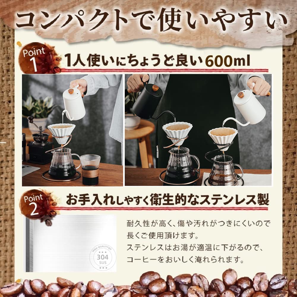 【高品質なステンレス素材】容量:600ml、重量:約500g、サイズ:122*65*96mm。ポット本体の重量は重くないため、準備する水の量は180mlから580mlまでであれば、問題なくお使えます。コーヒーぽっと本体は高品質の食品グレードステンレスと特殊なテフロン高温塗料、錆びにくい同時に、耐久性&耐食性に優れており、安全で無毒、簡単にお手入れ!