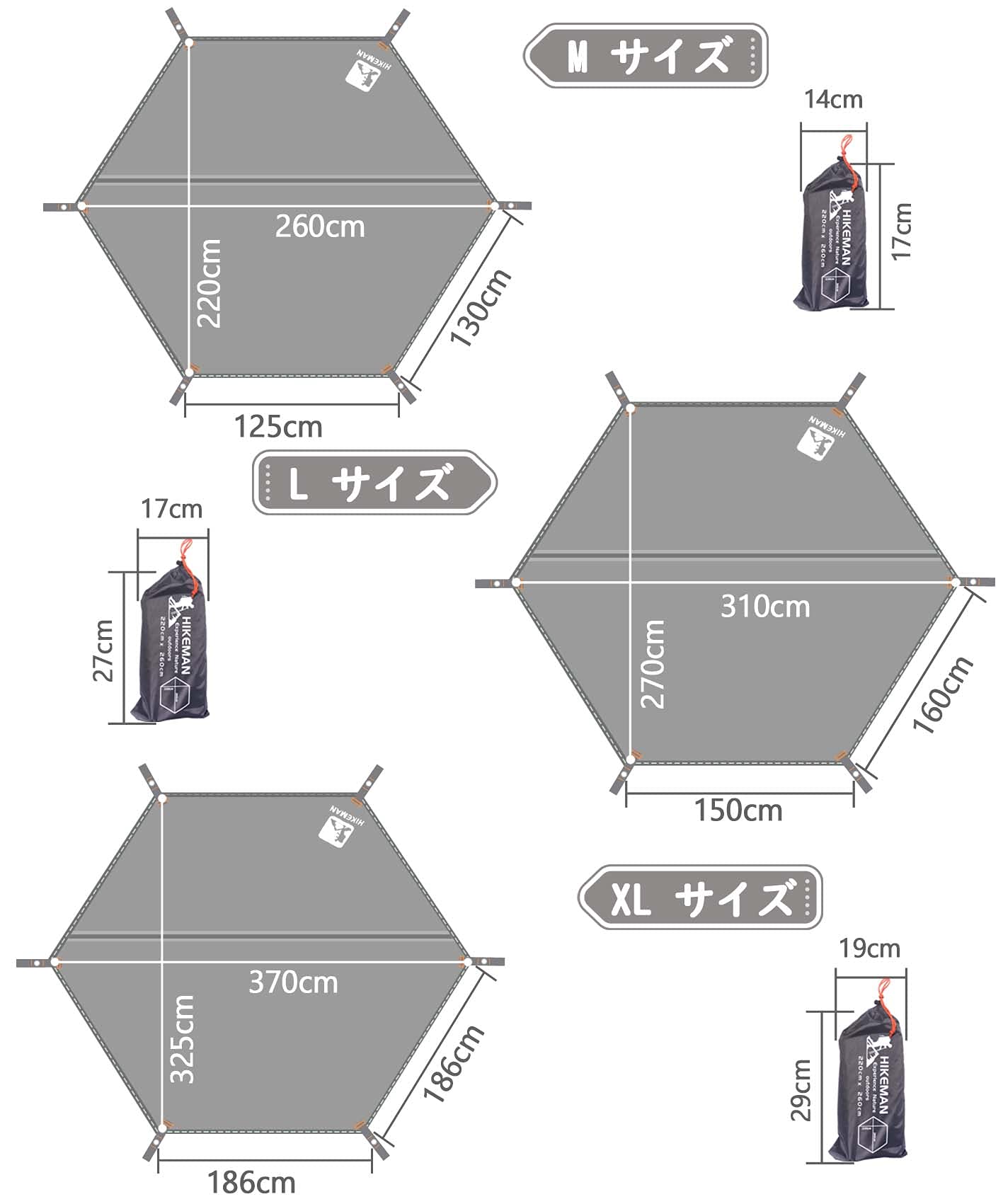 製品仕様:「六角」グランドシートMサイズ:220*260cm Lサイズ:270*310cm 材質:210Dオックスフォードクロス生地 付属品:合金アルミペグ*6本+収納袋 六角形なので、テントのグランドシートとして、特にワンポールテントにぴったりの形状です