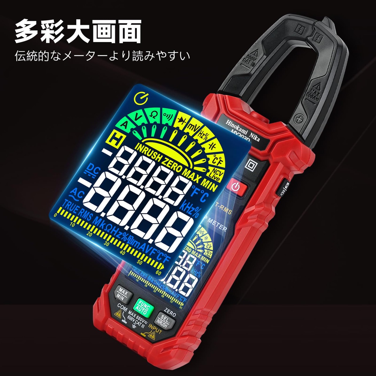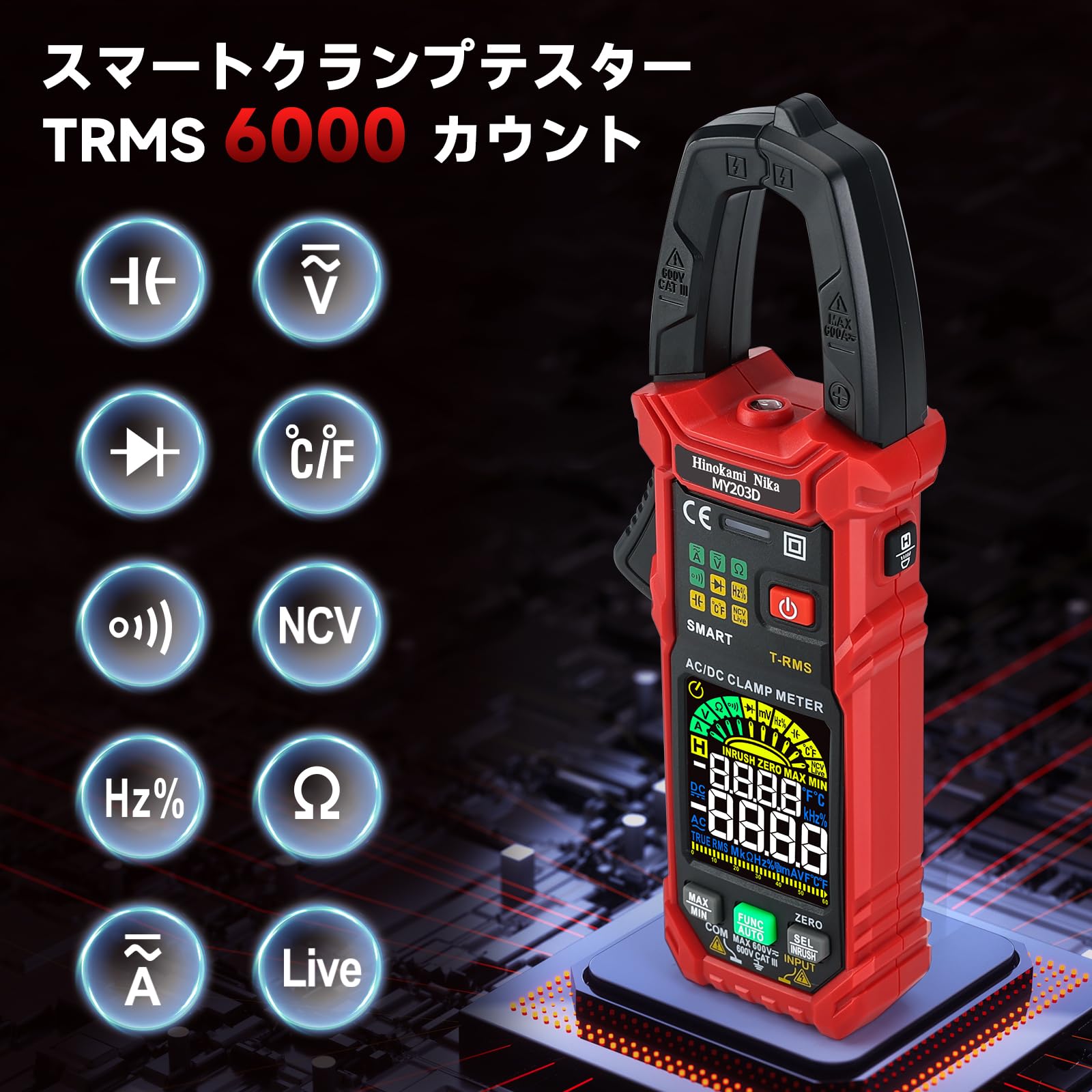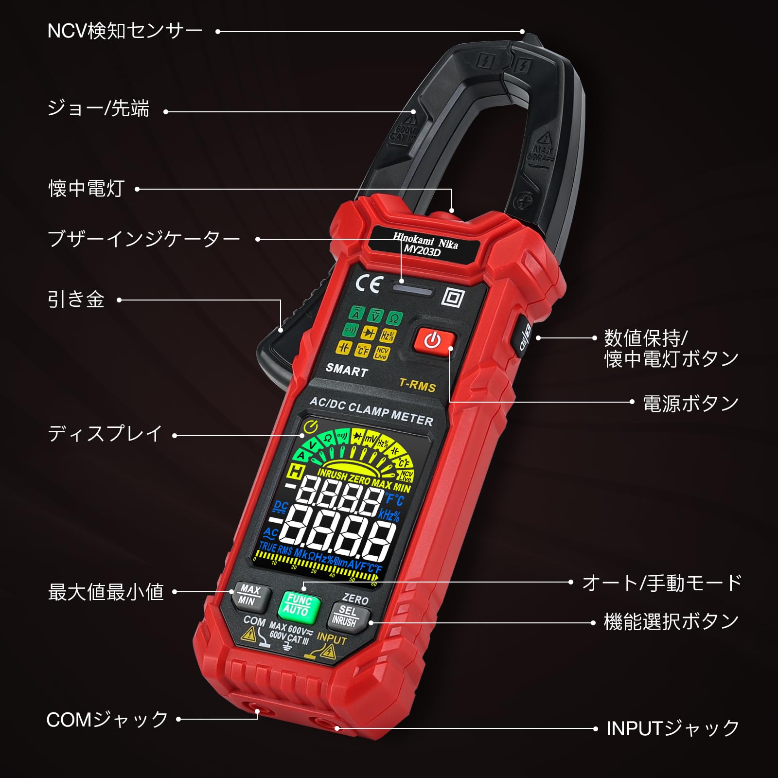 Hinokami Nika 2024新型MY203D クランプメーター DC電流 AC電流 6000カウント、暗電流クランプテスター 分解能10mAまで、電流計 クランプ 漏れ電流&突入電流測定でき、スマートマルチメーター オートレンジ、小型サーキットテスター 車、TRMSテスター AC/DC電圧 非接触電圧検知 抵抗 静電容量 周波数 温度 MAX&MIN値 懐中電灯&ケース付き 3年