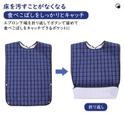 「キャッチポケット付き」 床を汚すことがなくなるエプロン下端を折り返してボタンで留めるとポケットになる仕様に設計しており、食べこぼしもしっかりキャッチできて、床掃除をする事も軽減してくれます。