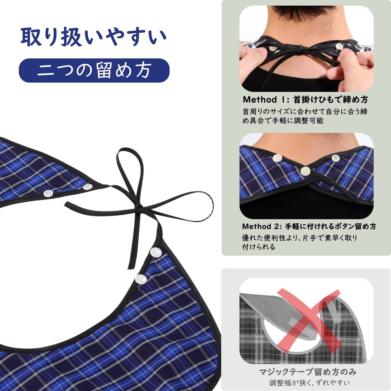「扱いやすい二つの留め方」 着脱しやすいひも?めとボタン留めの二つの留め方を備えており、子供、大人、要介護高齢者、障がい者など、どんな世代どんな状況の方でも、首周りのサイズに合わせて自分に合う留め方で手軽に利用していただけます。