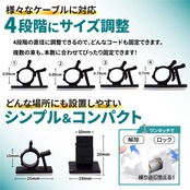 【繰り返し使える!4段階ロック機構】 4段階のロック機構でケーブルに合わせて固定することができます!ロックした後もワンタッチでロック解除ができるので繰り返し使えます。ガジェットが増えた際などのケーブルの増減に対応することができます。ロックも解除も押し込むだけなので狭い場所での取り付けも簡単です!