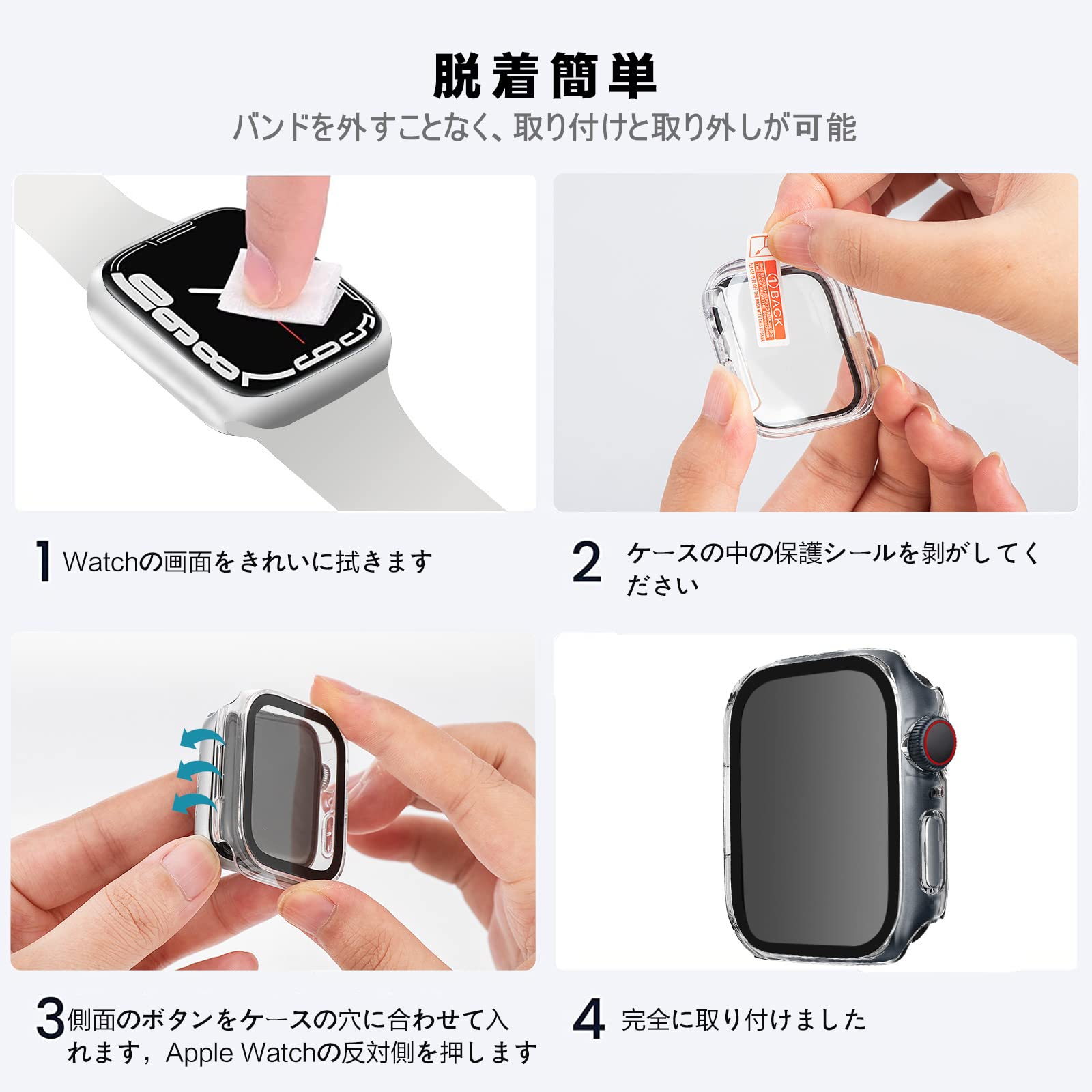 【防水・防塵ケース】シーリングリング内蔵したアップルウォッチ ケース、Apple Watchの画面にぴったりとフィットし、水の浸入を防ぎます。ほこりを完全に防ぎ、ケースを取り外して水を拭くすることを繰り返す必要はありません。疎水性撥油性抜群の強化ガラス表面により、カバー面に水が溜まらず、シャワー、手洗い、発汗、運動、雨など、日常の使用に適しています。 ※ご注意:ウォッチの画面とカバーの間に水が浸入する場合、保護カバーを取り外し、柔らかい布で水を乾かしてください。