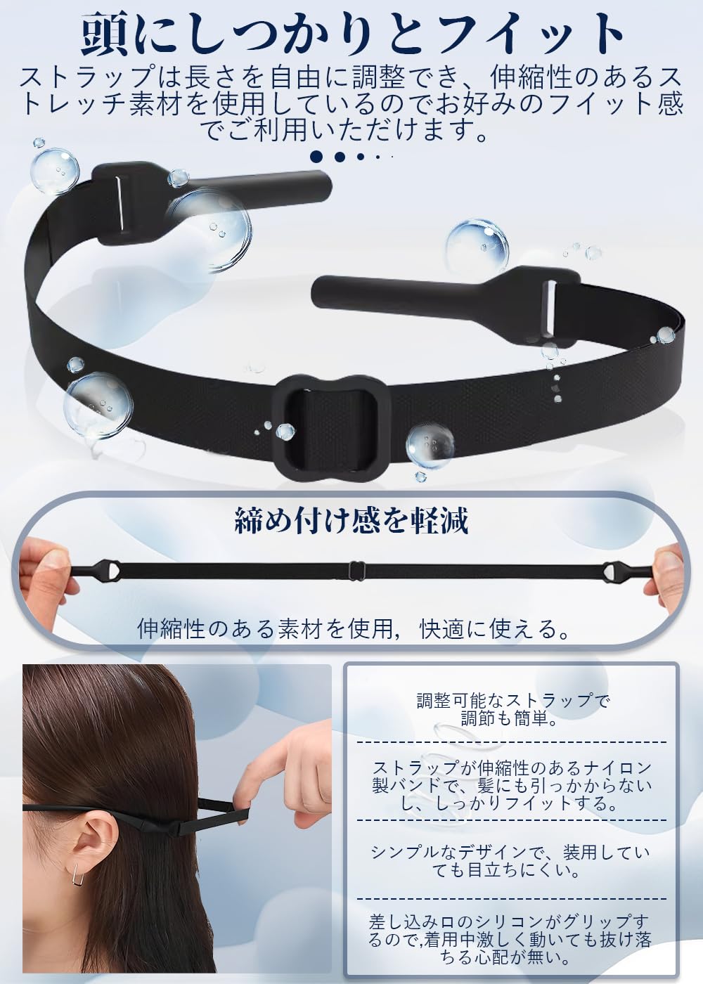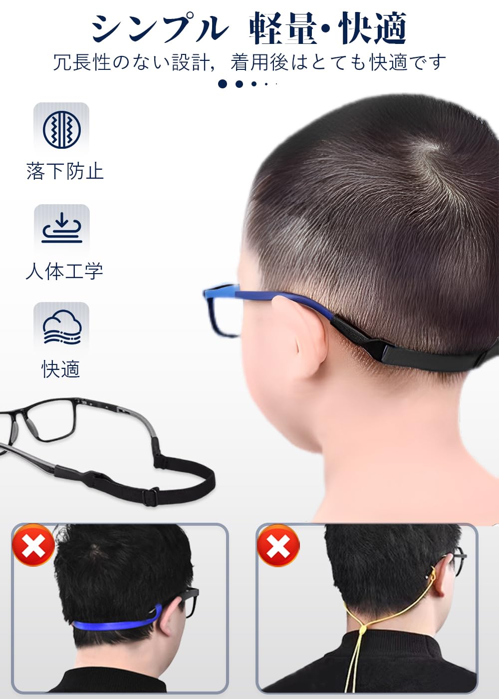 【適用場合】 普通のサングラス、近視メガネ、作業用のゴーグル、子供のグラス、スポーツグラス、カジュアルサングラス、スポーツサングラス、一般の眼鏡など様々なタイプにご使用いただけます。また、テニス、サッカー、野球、ゴルフ、自転車、ランニング、山登り、スキーなど激しい運動をされる方や、普段から眼鏡のズレ落ちが気になる方に最適です。