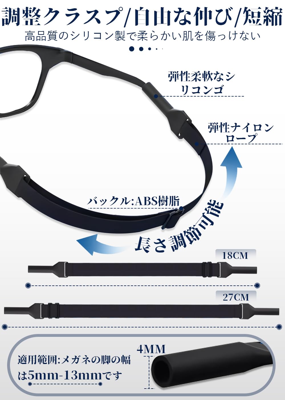 【調節可能 眼鏡ストラップ】:非常に標準的なサイズは繰り返し調整の悩みを避けます。(ご注意:メガネの脚4.5mm以下は使用できません)。