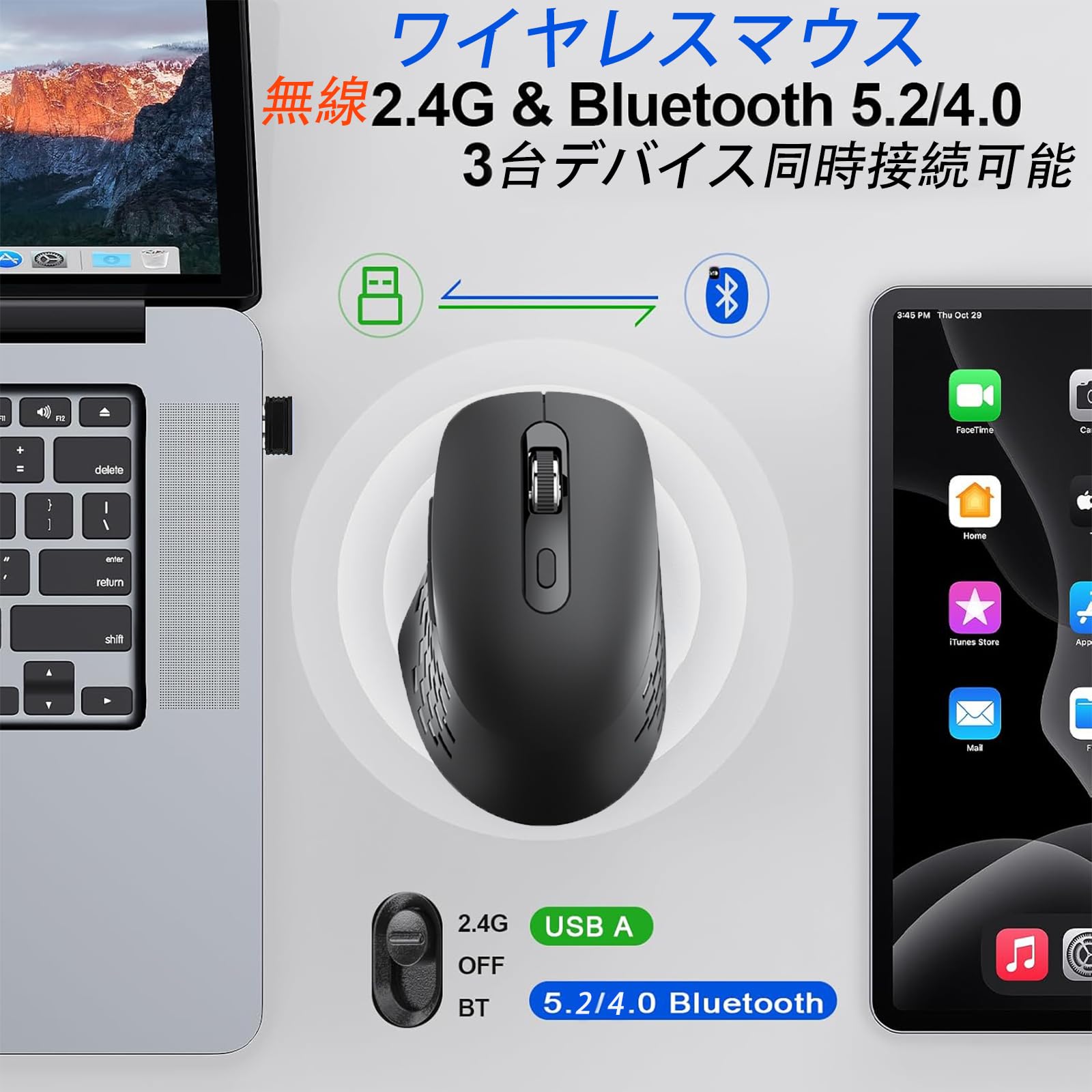 ワイヤレスマウス bluetooth 5.2 + 2.4GHz マウス 無線 静音 Type-C充電式 小型 戻る/進むボタン搭載 6ボタン 5DPI切替 3台デバイス同時接続可能 4000 DPI ゲーミングマウス 握りの極み デュアルモード Windows Mac iPad OS iOS Android ChromeOS対応 (ブラック)