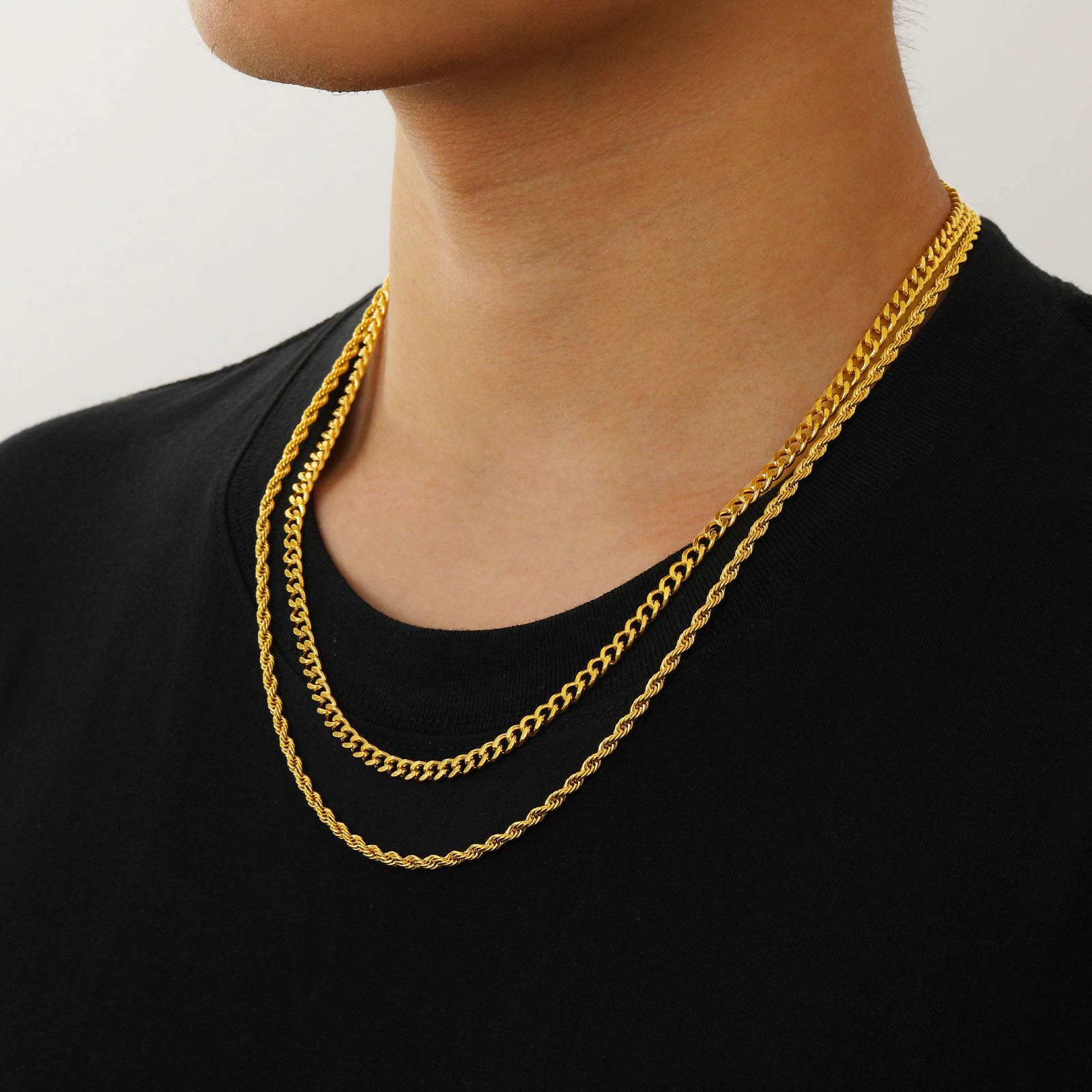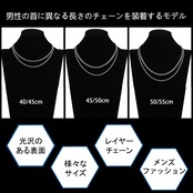 【豊富なバリエーション】メンズネックレスは、40/45/50/55cmの4つのチェーン長、ゴールド、シルバー、ブラックの3色から選択できて、多様なファッションニーズに対応しています。フィガロチェーン:幅5mm、ロープチェーン:幅3mmです。