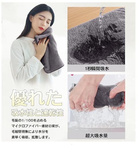 「優れた吸水性」マイクロファイバータオルなら、ぐんぐん水分を吸い取ってくれる、濡れた身体や髪をサッと拭き取れます。しっとりと柔らかくて吸水性に優れているので、ストレスなく使えます。