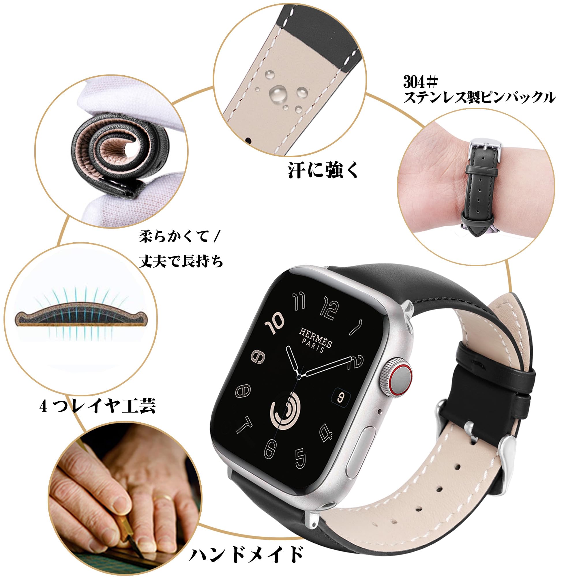 【上質な素材】本製品はアップルウォッチの交換ベルトです。高品質の天然本革を採用し、平紋が施された牛革で作られています。手で触れると、柔らかくて,滑らかで、すっごく気持ちが良いです。(本製品は複雑な 4 層レイヤ工芸を採用しており、上品で高級感あふれる雰囲気を醸し出します。特殊なデザインにより、部分的に厚みを持たせています。そのため、初めて装着する際は、硬くて使いづらい感じがあるかもしれません。しかし、何度も使用するうちに徐々に馴染み、快適に使用できるようになります。)