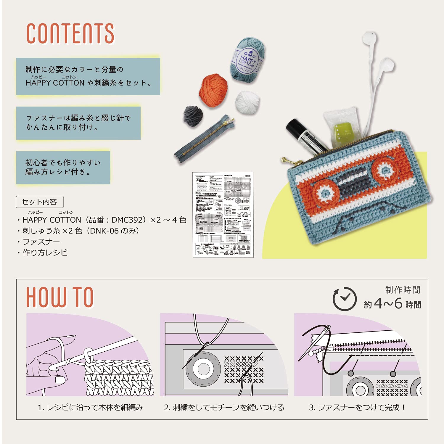 人気のDMC HAPPY COTTONで編んで作るレトロポーチのキット、カセットです。