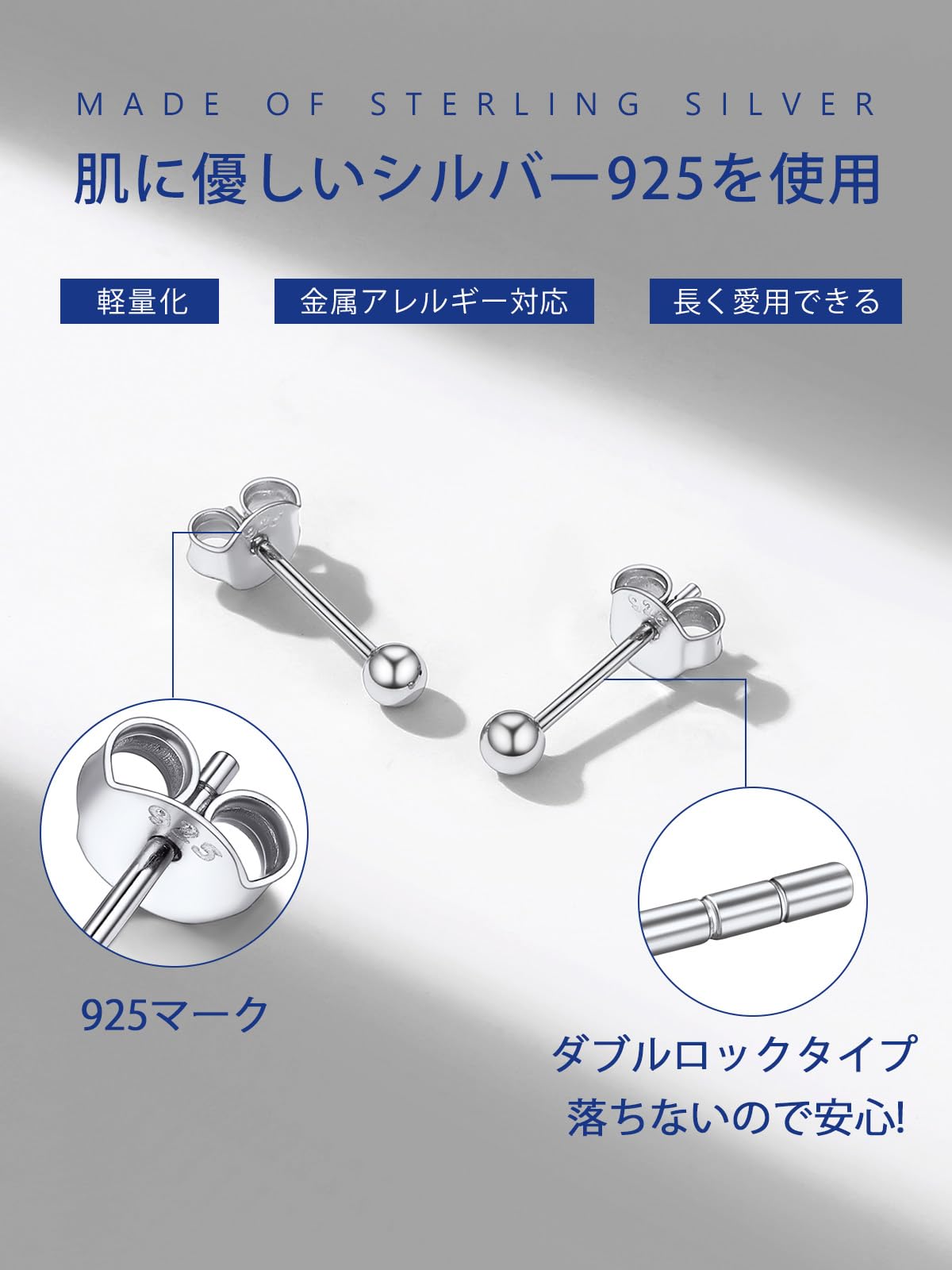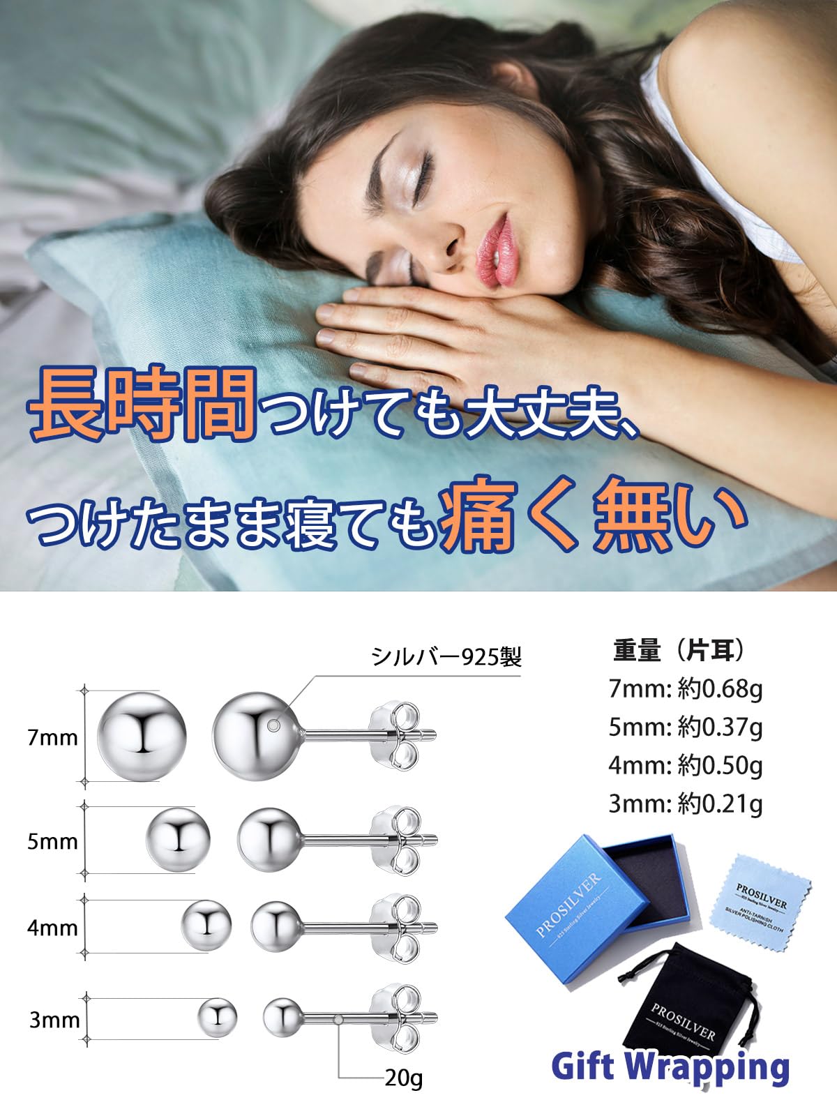 PROSILVER レディース ボールピアス つけっぱなし シルバー925 金属アレルギー対応 男女兼用 アクセサリー 普段使い シンプル 小さい 両耳 錆びない 3mm/4mm/5mm/7mm