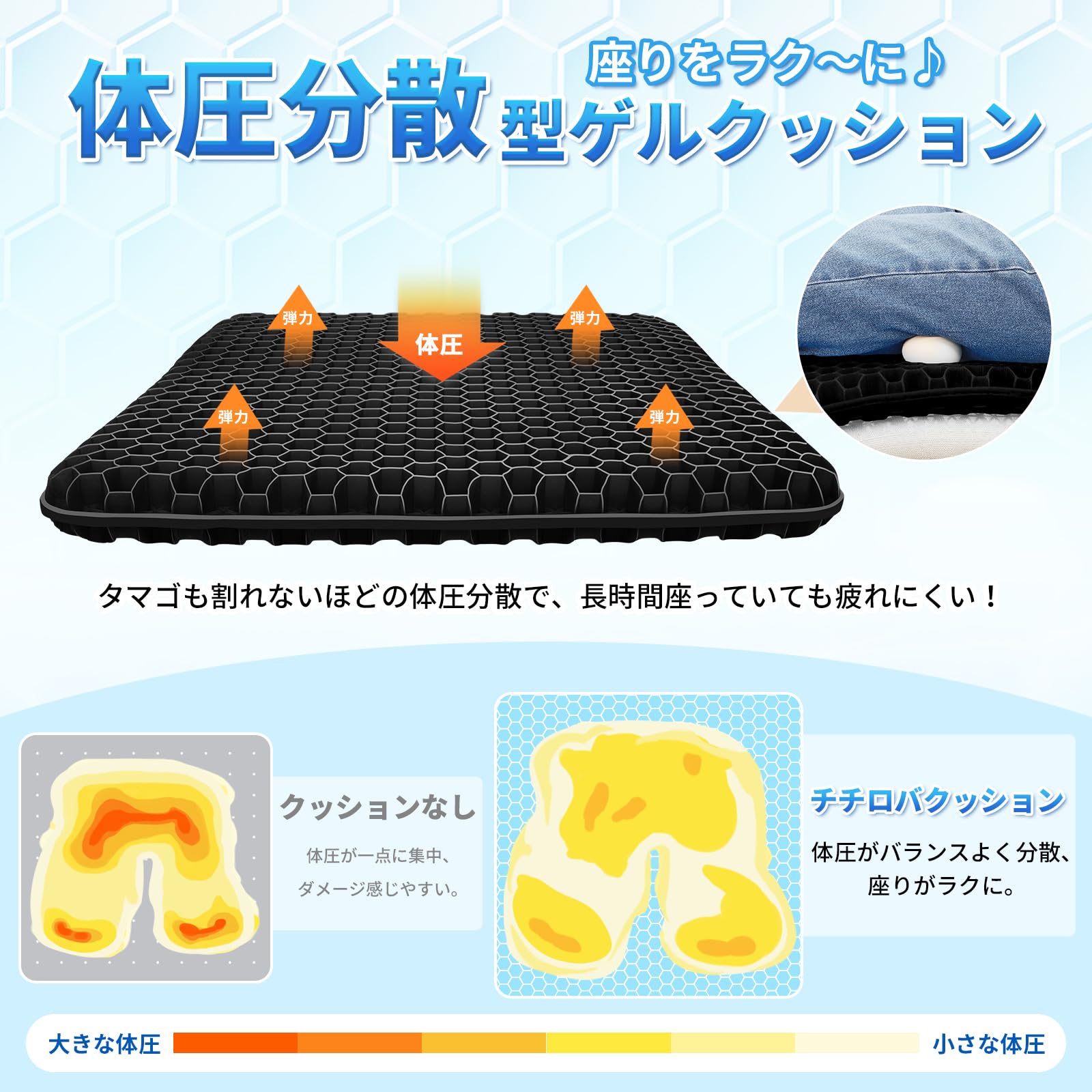 【体圧分散・人間工学に基く設計】クッション性に富んだTPE素材並びに、ハチの巣のような二層構造で効率よく体圧を分散。長時間の座り仕事でも疲れにくいクッションです。集中しやすいように付属カバーの滑り止めも強化しました!