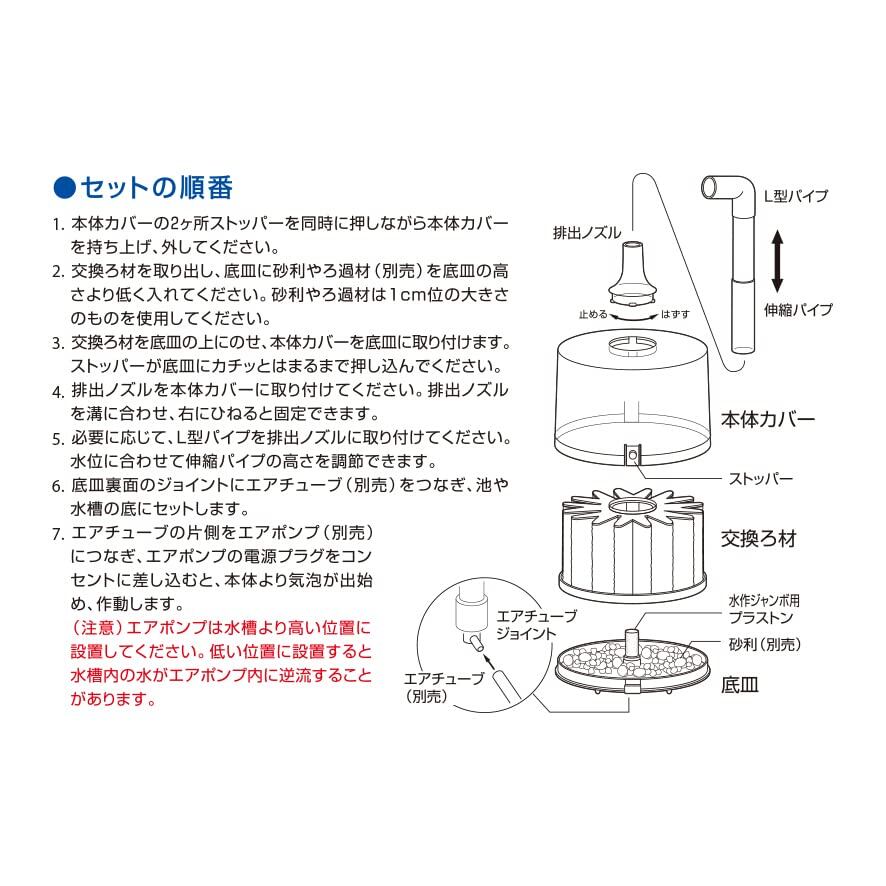 大きなゴミを取り除き(物理ろ過)、水の汚れを分解する微生物(生物ろ過)の繁殖に適した目詰まりのしにくい特殊三層構造のマットです。独自の特許技術により多方向(水中や砂利の中)から水を吸い込み、魚や微生物に効率よく酸素を供給します。底皿には砂利以外にもセラミックなどのろ過材を入れることができ、ろ過能力がアップします。(生物ろ過)