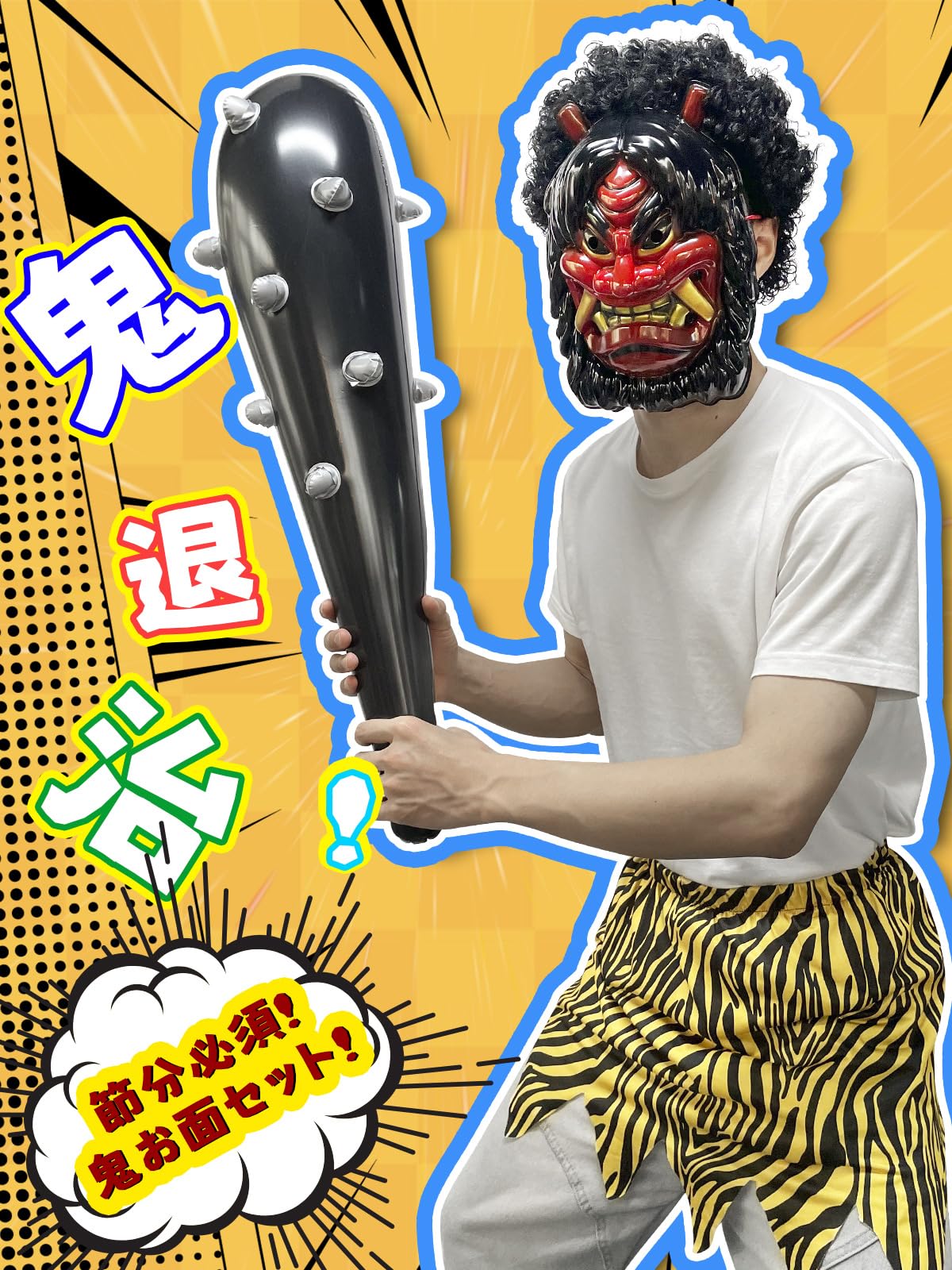【商品特徴】:節分の鬼コスプレ衣装ならコレ!真っ赤/青な鬼のお面は節分の必須アイテム!怖そうに見える軽量のお面が、ゴム紐で被るので着脱しやすいです。節分定番の虎柄パンツはウエストのゴムで伸びて、高品質のポリエステル制で着心地が快適です。風船タイプのこん棒は叩いても痛くない、金属色の棘はよりリアル感が出ます。アフロウィッグと合わせると、ワイルドな鬼を演出します〜