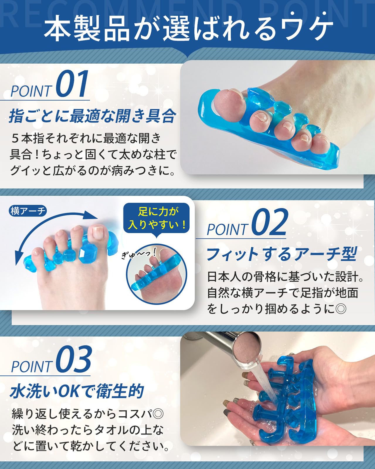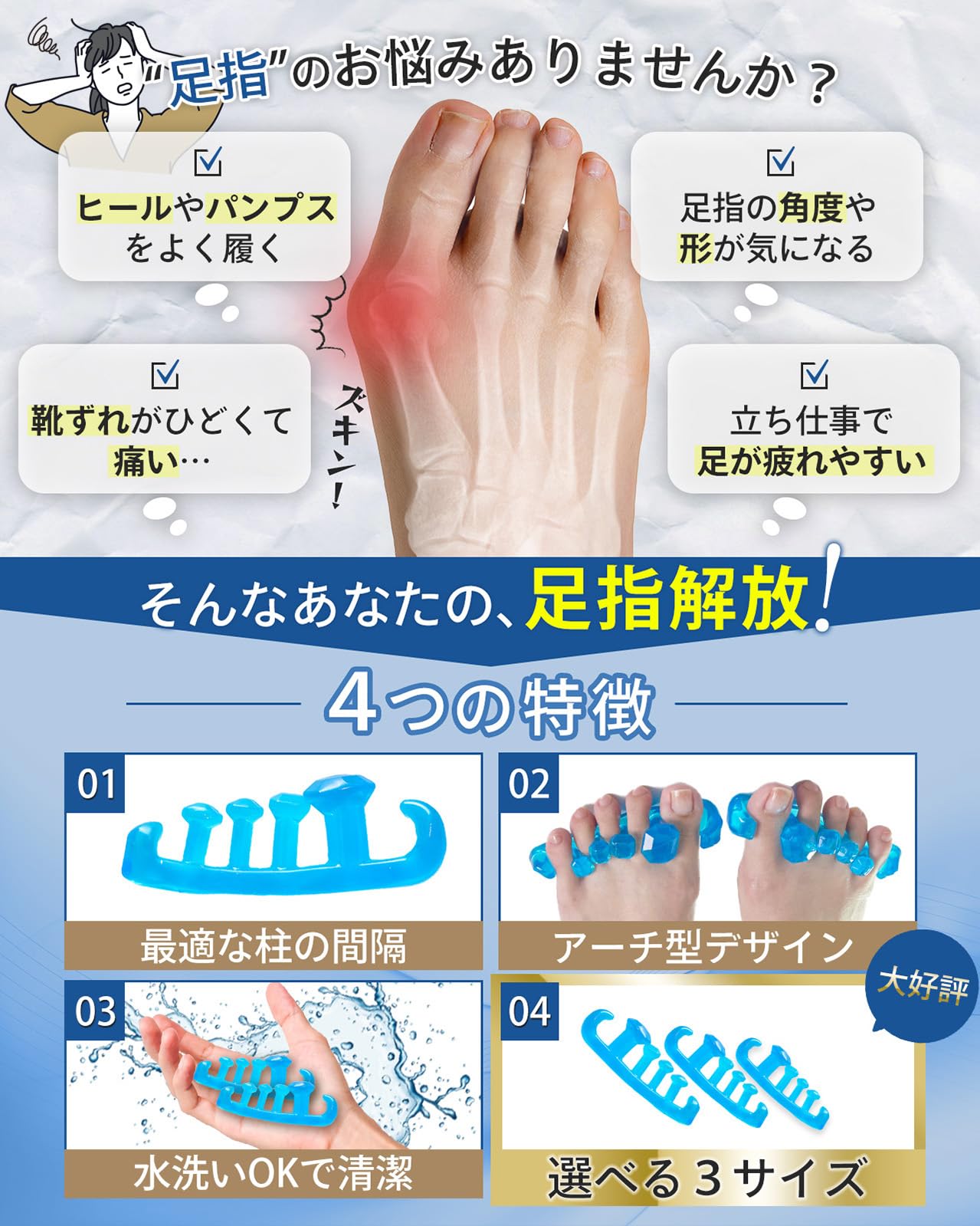 ?【コスパ◎清潔感◎】耐久性があり水洗いすることで、清潔な状態で繰り返しご使用いただけます。タオルの上で自然乾燥させてください。?【プロ監修の説明書付き】「3種類の足指セパレーターの使用方法」「日本人の骨格と足のトラブル」「足指ストレッチ」外反母趾・内反小趾にお悩みの方はぜひご自身の足指の状態を確かめ、適切なケアにご活用ください。