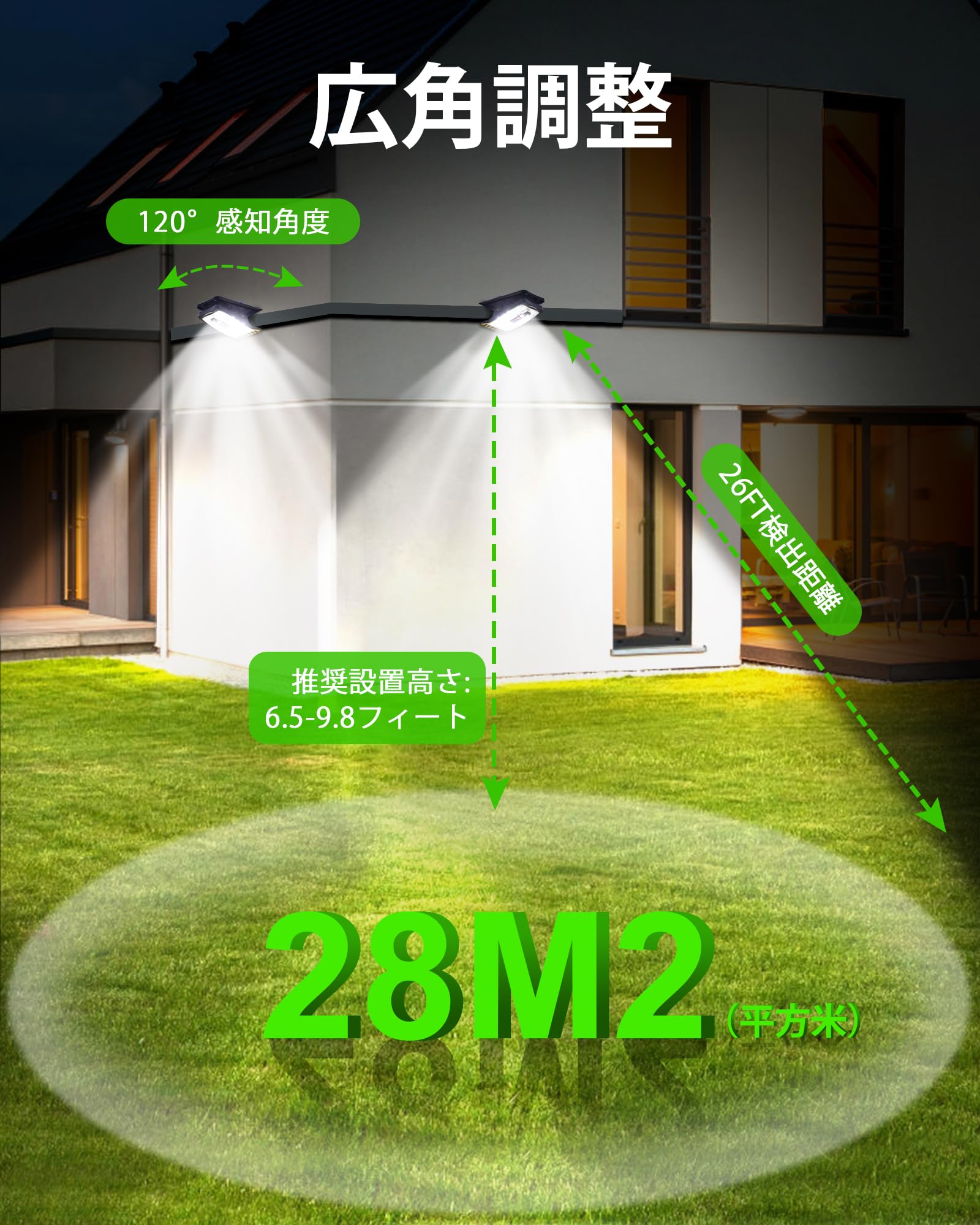 【高輝度 人感センサーライト 屋外 】ソーラーライト 屋外 人感センサーは改良版の70個LEDライトを搭載しているので、最大8m と120°までの照明範囲を覆われます。それにより800ルーメンの明るさを実現しより気軽にイルミネーショを楽しめます。屋外センサーライト最高の照明性能を得るために、設置高は約1.5-2.5mをお勧めします。