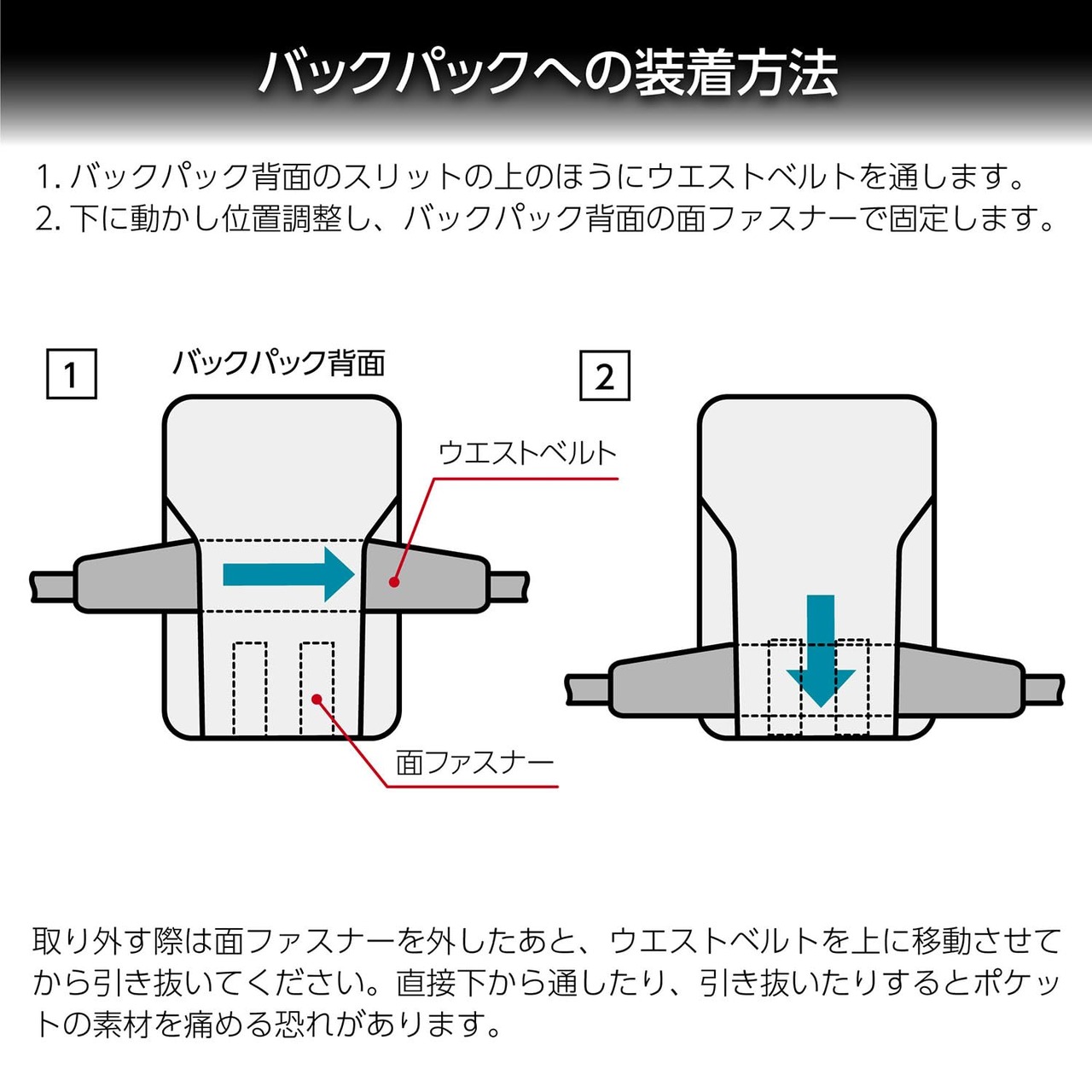 「GW-PRO ウエストベルト装着可能」と記載のあるバッグにのみ装着が可能。