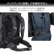 GW-PRO シリーズのバックパックに装着することで、腰骨をしっかりサポートしフィット感が向上します。腰でも重量を支えることにより加重が分散され、肩や背中への負担が軽減されます。