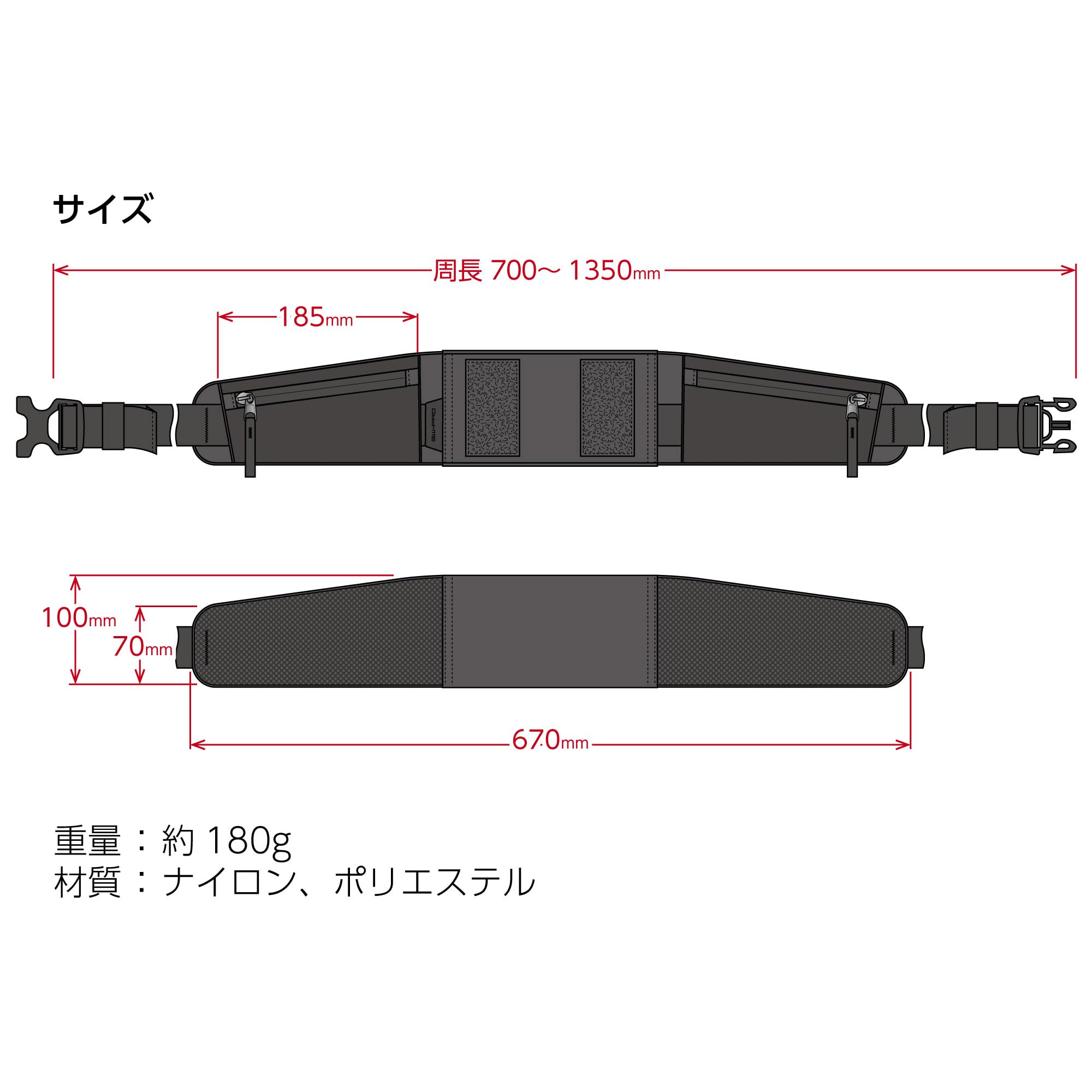 ウエスト周長 : 約W700 〜 1350mm、重量 : 約180g、材質 : ナイロン、ポリエステ