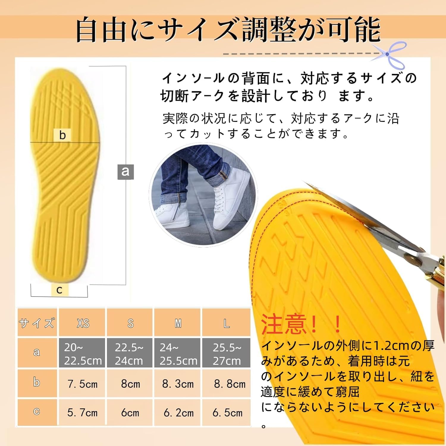 【調整可能なサイズ】注意 インソールの外側の高さは内側の高さより高く、外側の高さは約1.2cmです。靴を履くときは、古いインソールを取り除き、靴紐を適度に緩めて、靴がきつくならないようにしてくださいXS(20〜22.5cm)、S(22.5〜24cm)、M(24〜25.5cm)、L(25.5〜27cm) 、XL(27〜28.5cm)ハサミでサイズ微調整可、商品不満なら、返品・交換受けます