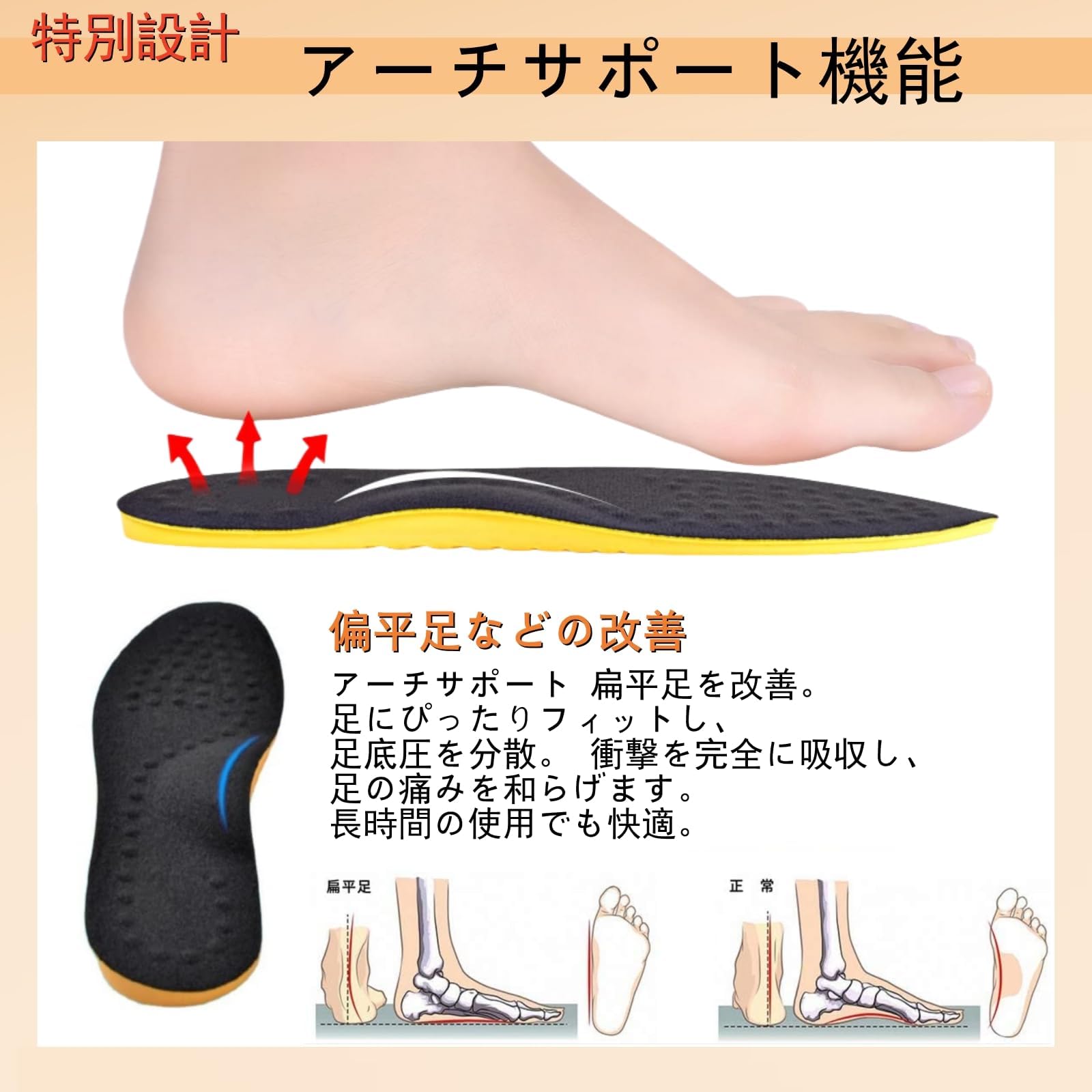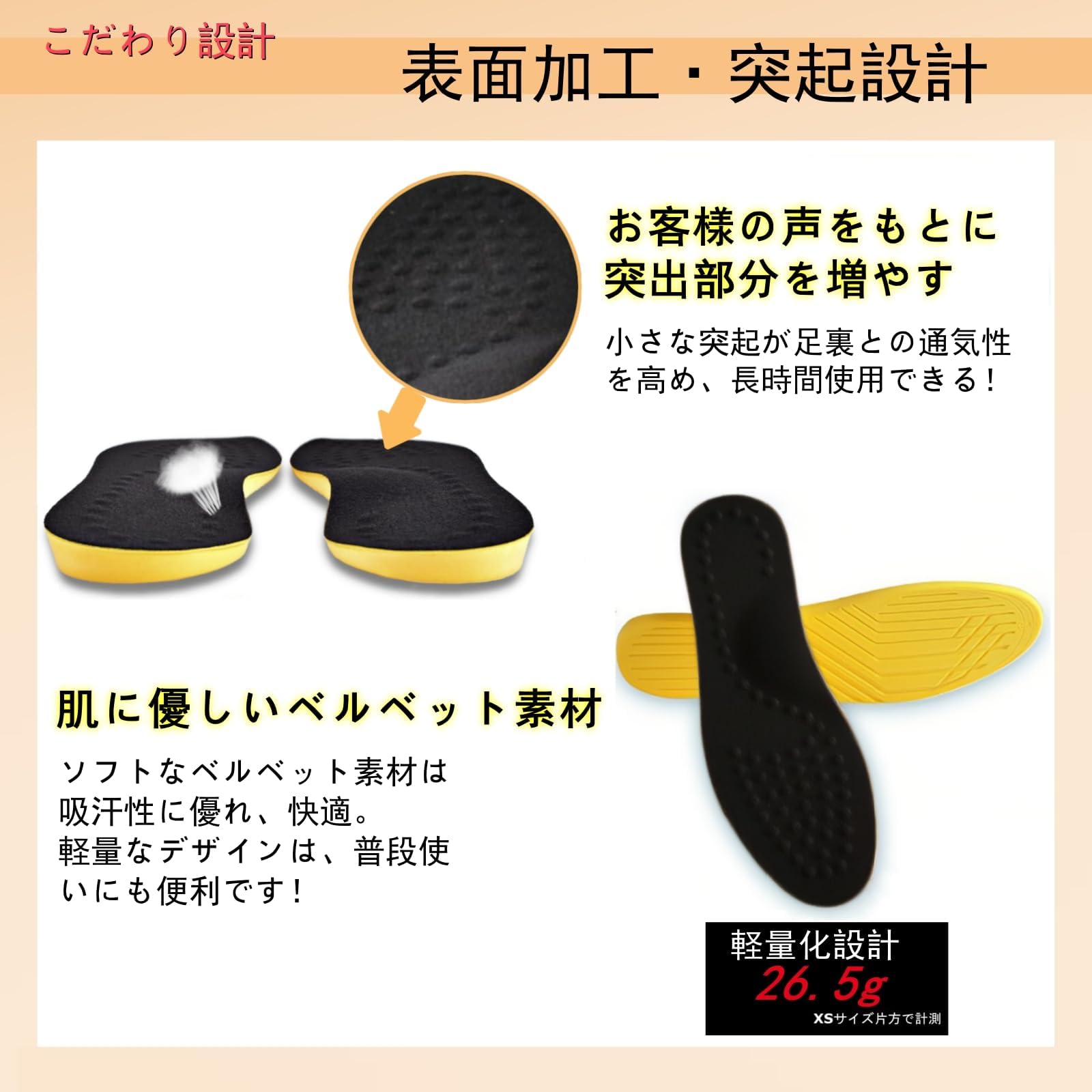 【突起設計】インソール表面の小さな突起で足裏マッサージを実現し、圧力分散し、負担を軽減します。疲労感なく快適です。側面アーチサポートで正しいアーチを保ち、足のバランス改善、フィット感良く体の歪みを改善します