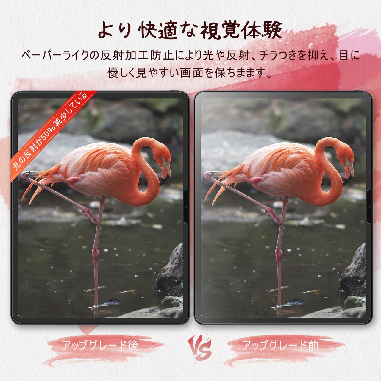 【反射防止効果アップ】グレードアップした保護フィルムのアンチグレア効果は以前より50%アップ、日光や照明による反射を抑え、液晶のまぶしさを防ぐので、画面が見やすくなり、目を優しく守ります。指紋付着防止と防水性もあるので、清潔でまぶしくなく快適に画面を見ることができます。
