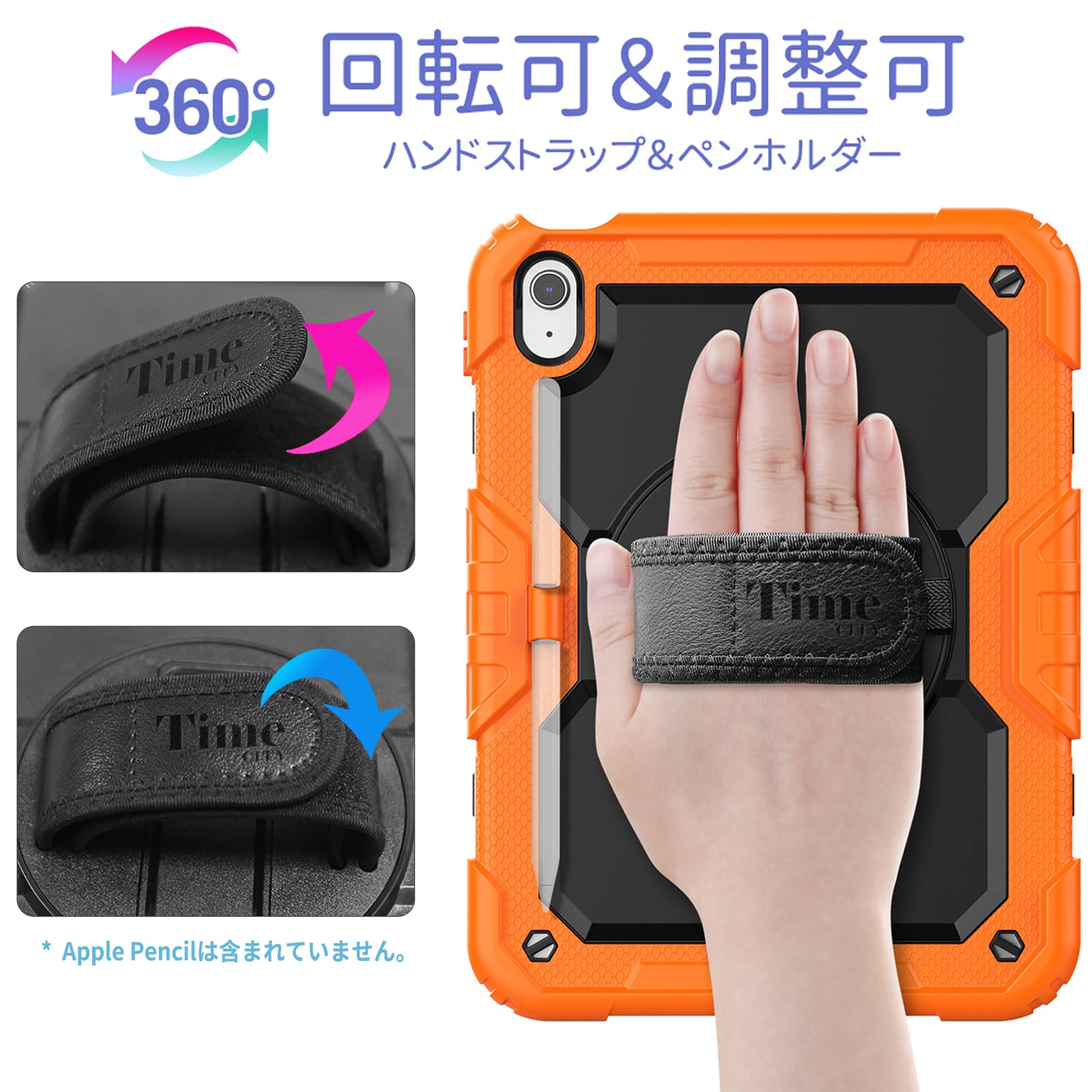 Timecity iPad 第11/10世代 ケース (2025/2022)対応 耐衝撃 iPad 11世代/ 10世代 ケース 360度回転スタンド 保護フィルム付き 傷つけ防止 頑丈 耐久性 ハンド&ショルダーストラップ付き ペン収納 肩掛け 多機能 工事 現場 子ども iPad 10.9インチ カバー 落下保護 1メートルテスト (オレンジ)