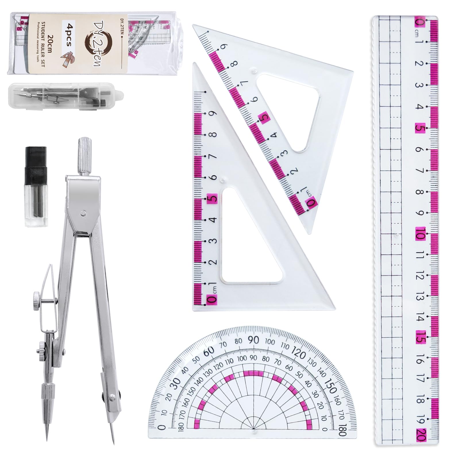 DY.2ten 定規・コンパスセット 学生用定規セット コンパス 20cm直定規 三角定規 半円分度器 作図ツール 算数定規セット 小学生 文房具 幾何学 中学生 学用品 教師 スクール 多機能 製図定規