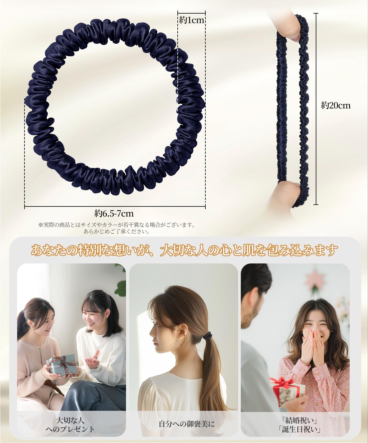 ?【細部までこだわり】上質なシルクを高密度に織り上げ、しなやかな風合いと光沢感を持ち、上品な印象を簡単に演出します。手首につけてブレスレットとしても使える使い勝手のよい髪飾りです。シルクヘアゴムの縫い目を丁寧に仕上げ、ほつれの心配がありません。内側のゴムリングは、伸縮性に優れたポリエステル素材で作られており、ちぎれるリスクも低いです。また、植物染料を使用した染色方法を採用しており、より環境に優しいです。