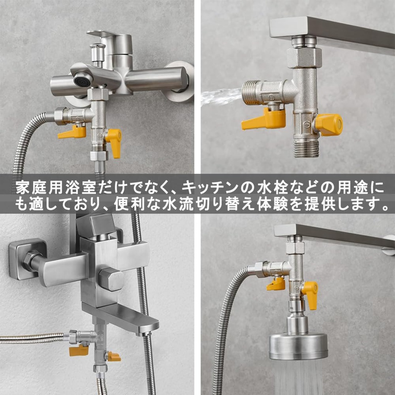 【多機能T型インタフェース】注意深く設計されたG1/2インチのインタフェースサイズは、さまざまな浴室アクセサリー、シャワーヘッド、シャワーハンドル、シャワーホースなどに接続できます。家庭用浴室だけでなく、キッチンの水栓などの用途にも適しており、便利な水流切り替え体験を提供します。