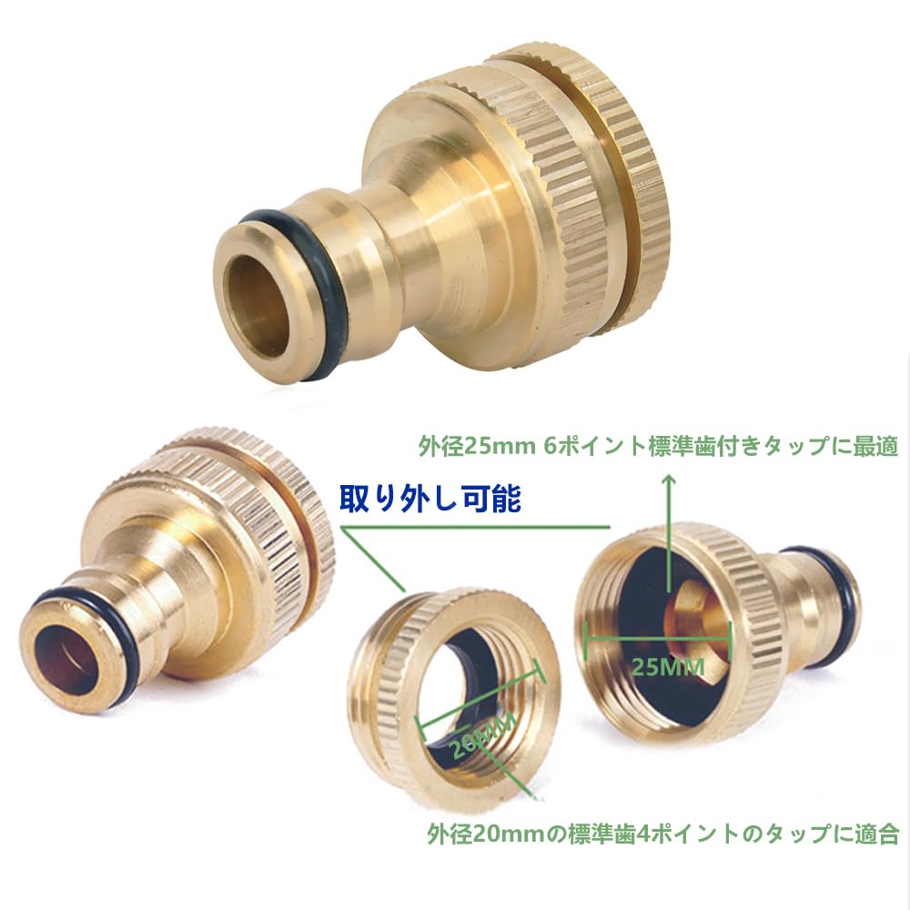 ??【セット内容】蛇口コネクター×1個、ホースジョイント×1個 ??【素材】真鍮製で見た目もよく、直射日光や凍結にも強い作りになっています、は耐腐食性と防錆性があり屋外での長期使用に適しています。【ご注意下さい】モニターの環境により、色の見え方に若干差が生じる場合がございます。 ??【簡単取り付け】簡単なインストール、古くて壊れたものの直接の交換です。 ??【さまざまな蛇口に対応】2つのサイズが1/2インチ(21mm)と3/4インチ(26.5mm)で利用でき、タップとホースをすばやく接続するのに役立ち、すべての屋外ネジ式タップの95%での使用に適しています。暖かいヒント:タップは雄ねじ式である必要があります。 ??【幅広い用途】ホースとの接続口はゴムパッキンが付いていて、水漏れしにくい設計です。庭の灌漑のPVC散水パイプ、水道管、適切なサイズの蛇口接続に最適です。洗濯機の蛇口と水道管の接続もでき、庭、農作業、校庭など、様々な場所に適用されます。庭園、バルコニー、温室、菜園、鉢植えの植物、ペットの入浴、洗車、道路の洗浄などに適しています