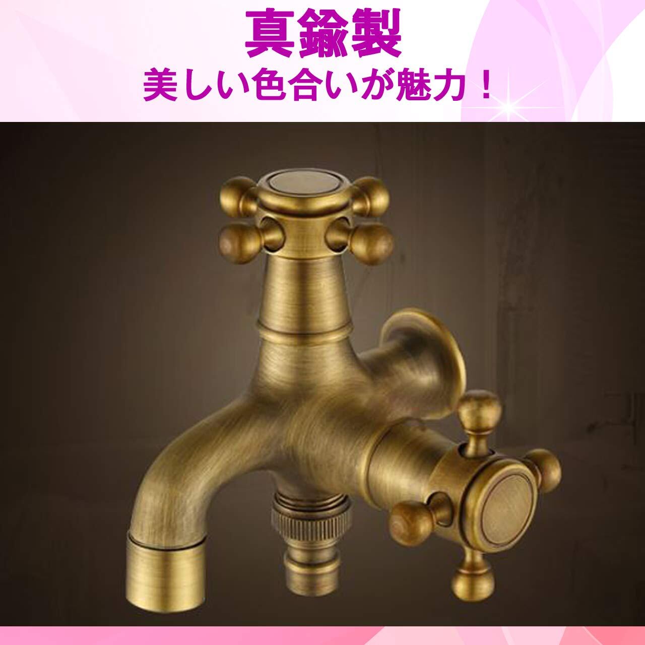 フェリモア 2口蛇口 水栓 交換 アンティーク風 真鍮製 レトロ 分配 散水栓 庭 屋外 リフォーム (ゴールド)
