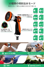 ??【10種類の散水モード&使いやすい散水ノズル】 散水ホースのノズルは10-in-1設計で、10種類の散水モードがあり、使用シーンに応じて散水モードを切り替えることができます。 例えば、庭の花の水やり、洗車、地面のコケ掃除などの場合、水圧と散水量を切り替えることで効果を発揮します。 また、スイッチを長押しする必要がない設計なので、長時間使用しても手のひらが疲れにくいです。 散水ノズルのハンドルには滑り止め加工が施されており、水に触れても落ちにくいです。 ホースのノズルも使いやすさを追求したデザインです。