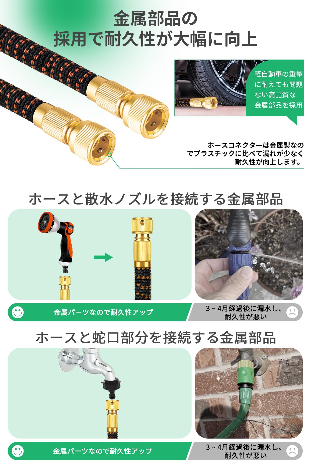 ??【高品質ラテックスを採用&優れた伸縮性】3倍伸縮ホースは、従来品を改良しました。 伸びるホース内層には伸縮性と回復性に優れた高品質2mmラテックスを採用し、伸縮ホースの耐久性と使用時の伸縮速度が向上しました。 外層は耐摩耗性に優れた3450D素材で作られており、伸びるホースが硬い路面を引きずったときに内側のラテックスが傷つくのを防ぐ。 また、伸縮ホースは-10℃〜60℃の環境下で1〜3倍の長さに伸ばすことができます。多くの地域で、いつでも問題なく使用できる。