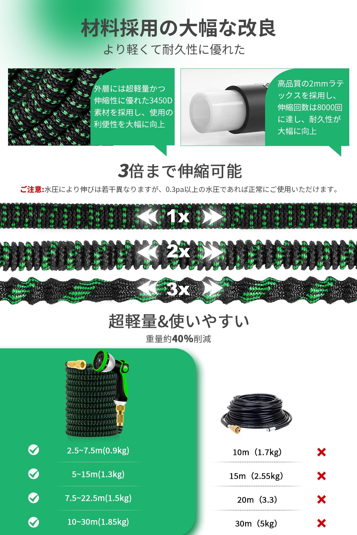 ??【高品質ラテックスを採用&優れた伸縮性】3倍伸縮ホースは、従来品を改良しました。 伸びるホース内層には伸縮性と回復性に優れた高品質2mmラテックスを採用し、伸縮ホースの耐久性と使用時の伸縮速度が向上しました。 外層は耐摩耗性に優れた3450D素材で作られており、伸びるホースが硬い路面を引きずったときに内側のラテックスが傷つくのを防ぐ。 また、伸縮ホースは-10℃〜60℃の環境下で1〜3倍の長さに伸ばすことができます。多くの地域で、いつでも問題なく使用できる。