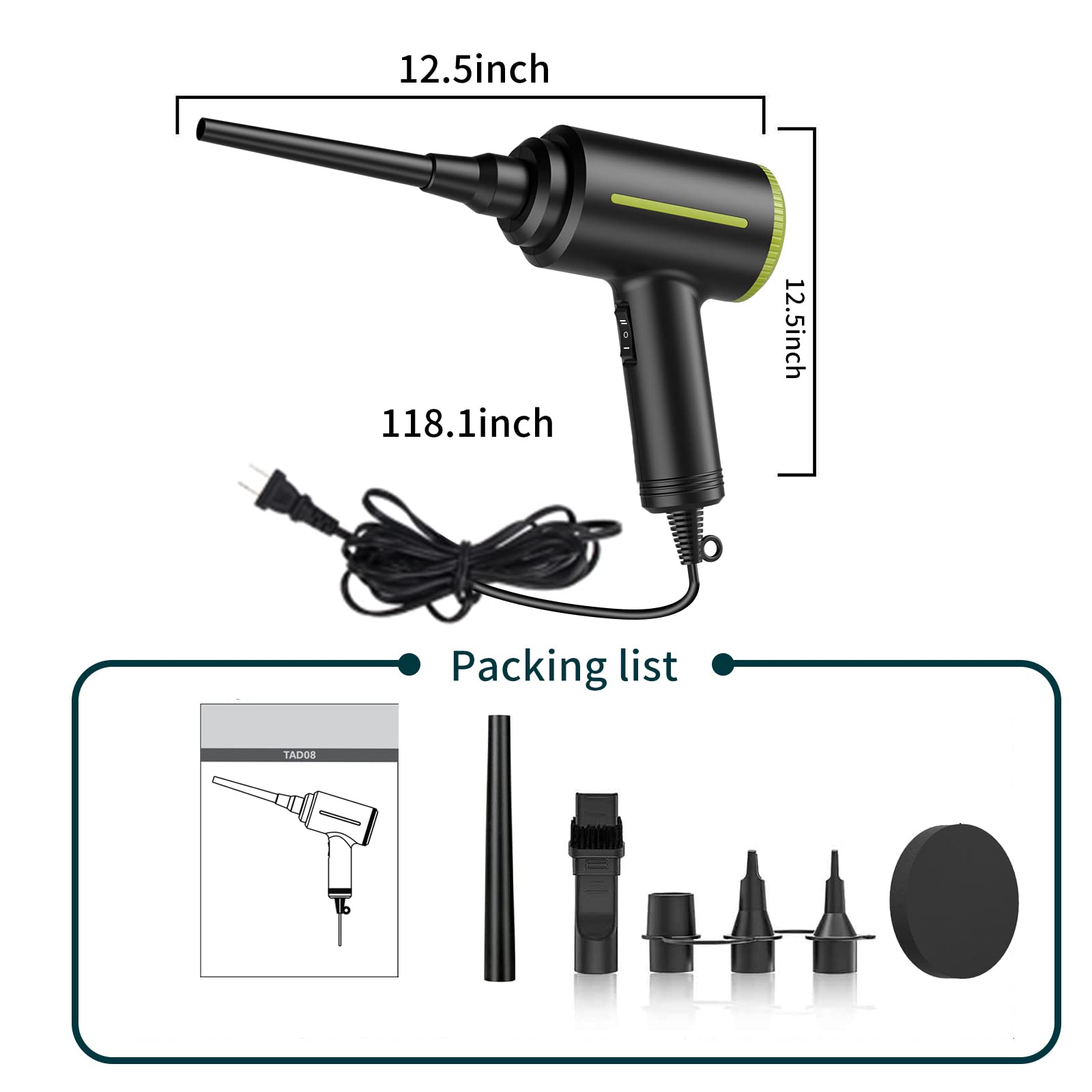 [500Wモータ]この電動エアダスターには、高出力の500Wモーターが搭載されています。2つの風速を調整できます。ローギアの出力は260Wです。電源コードの長さは10フィートです。家庭用および産業用に最適です。