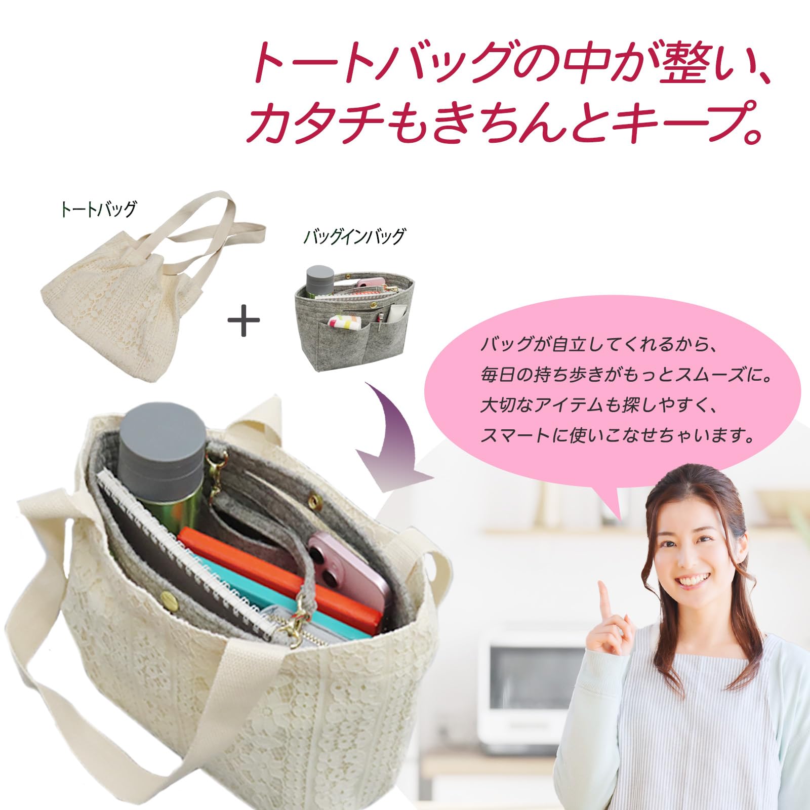 【便利なストラップとボタン付き】ストラップにより、バッグを替える際の中身の移動がとても簡単です。バッグから取り出しやすく、他のバッグへの移動も楽々。キラリと光るゴールドのストラップ 留め金具。可愛らしいデザインでそのまま持ち歩けて便利です。使用しない時は取り外しも出来ます。ストラップに鍵やパスケースを付けてもとても便利。 バックインバックの真ん中にあるボタンを閉じた状態ですと、ボトル、水筒やペットボトルが簡単に出し入れでき、バック内で倒れたりしません。