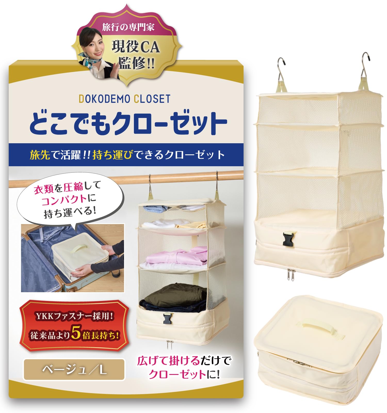 【現役CA監修】 トラベルポーチ 吊り下げ YKK クローゼット 収納 旅行 便利グッズ トラベルグッズ 圧縮袋 [LEAGOO] (ベージュ, L)